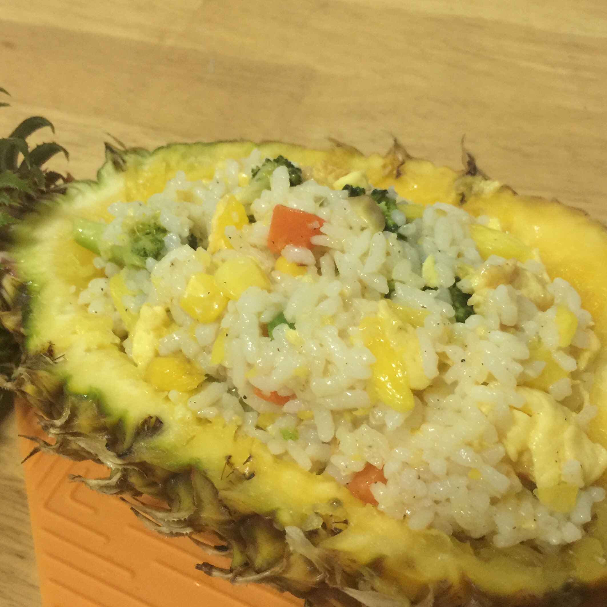 4. 饭炒好后加黄梨果肉,盛进黄梨壳,碗都不用洗了