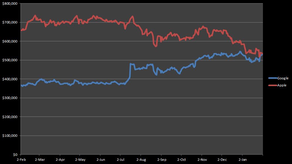 之前就暗示大家了,做空苹果期权,做多谷歌股票,相信大家应该是赚得不亦乐乎了吧。下图是网友在1月18号的图形。