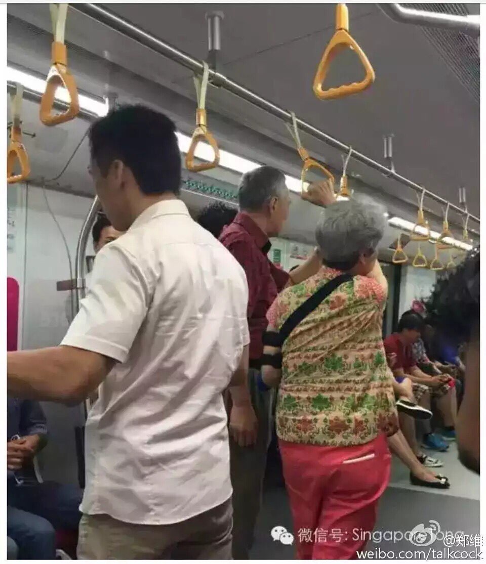 新加坡总理李显龙(深红衣服男)和太太何晶(灰白头发女士)新年坐地铁……没人让座