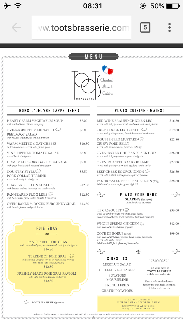 推荐你这家 应该非常适合你这家深藏在苏丹酒店里的法式小馆Toots Brasserie。在联合早报里看到对于这家的推荐,无论食物和环境都会让你称赞。有一次老公过生日,我找到这家,真是值得一来。有图为证。