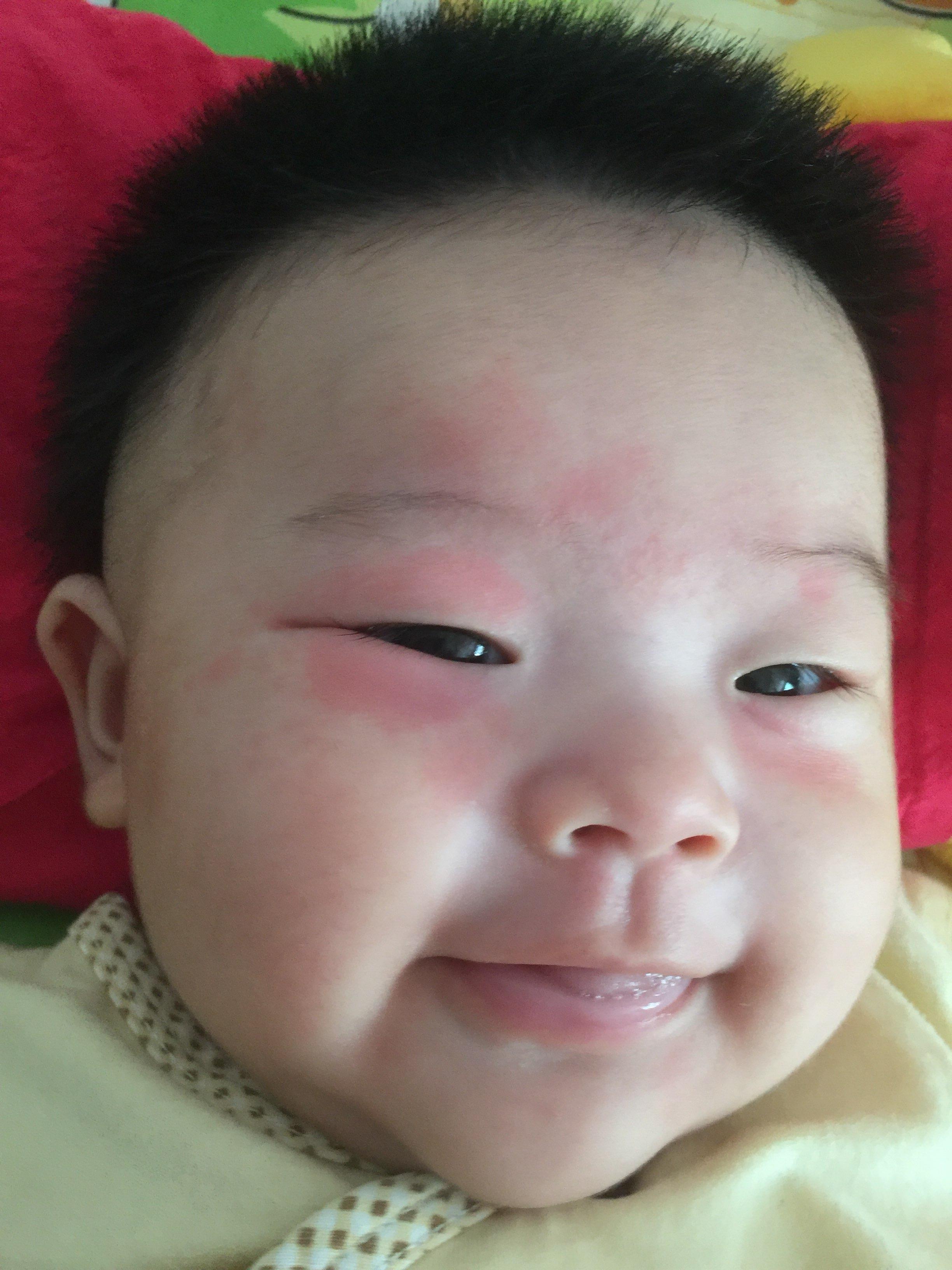 宝宝现在三个月半大。还没吃辅食。应该是我吃了什么不该吃的东西了。看来的确是过敏了。给宝宝洗完澡后好多了没那么吓人了。