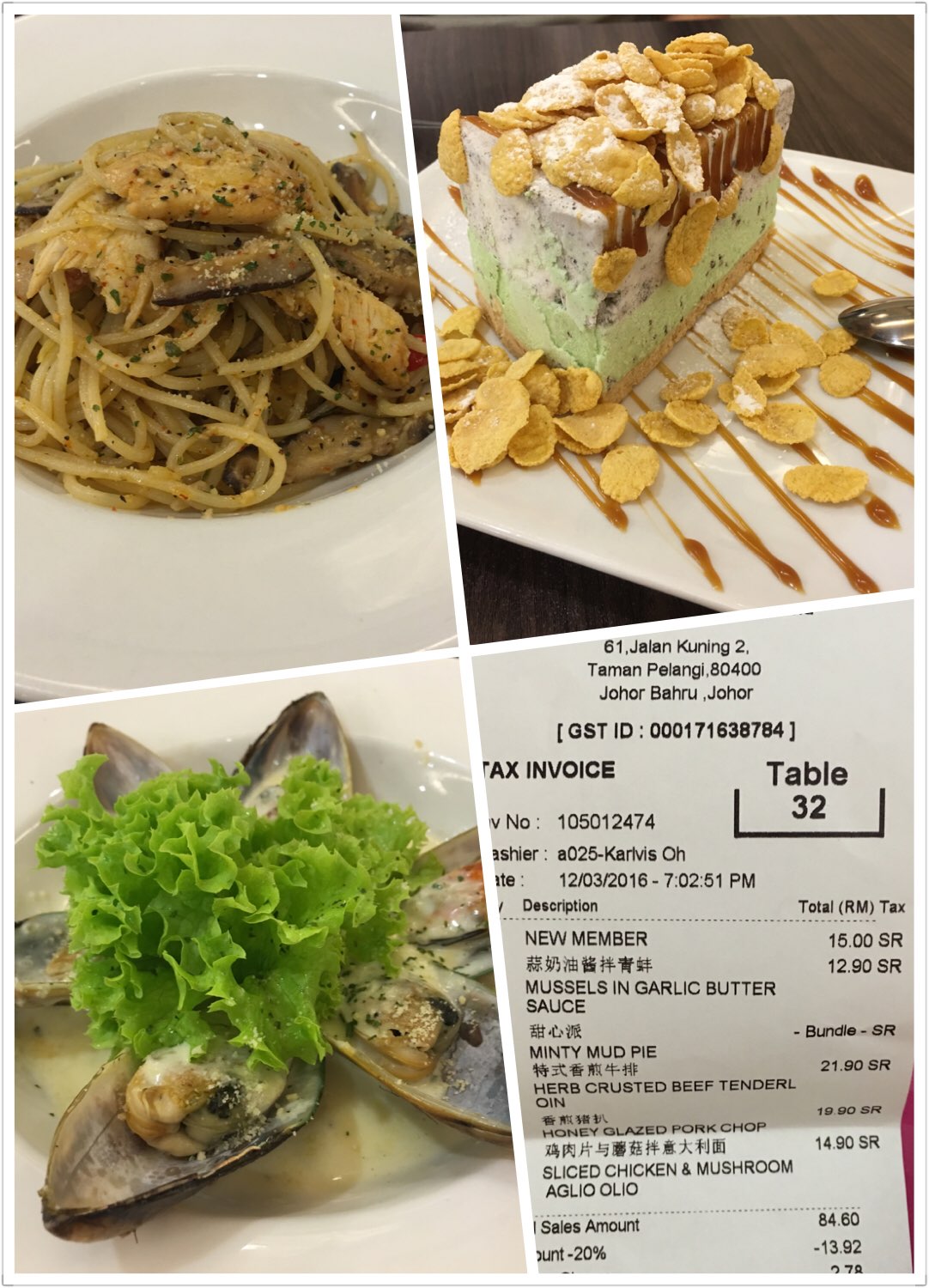图片是甜品,蘑菇鸡肉干炒意面和cream mussel。收据上有餐馆地址和菜的大概价钱