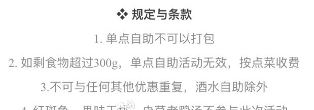 至于第四条只能说他们练了金钟罩铁脸皮刀枪blue你怕大家赖着不走完全可以限制用餐时间啊,不能要求餐馆像Starbucks麦当当一样叫不叫东西随便坐,但是没有限制点菜时间这种nc规定吧?餐馆自助完全可以规定两个小时内吃完吧,一个小时那是午餐好么?