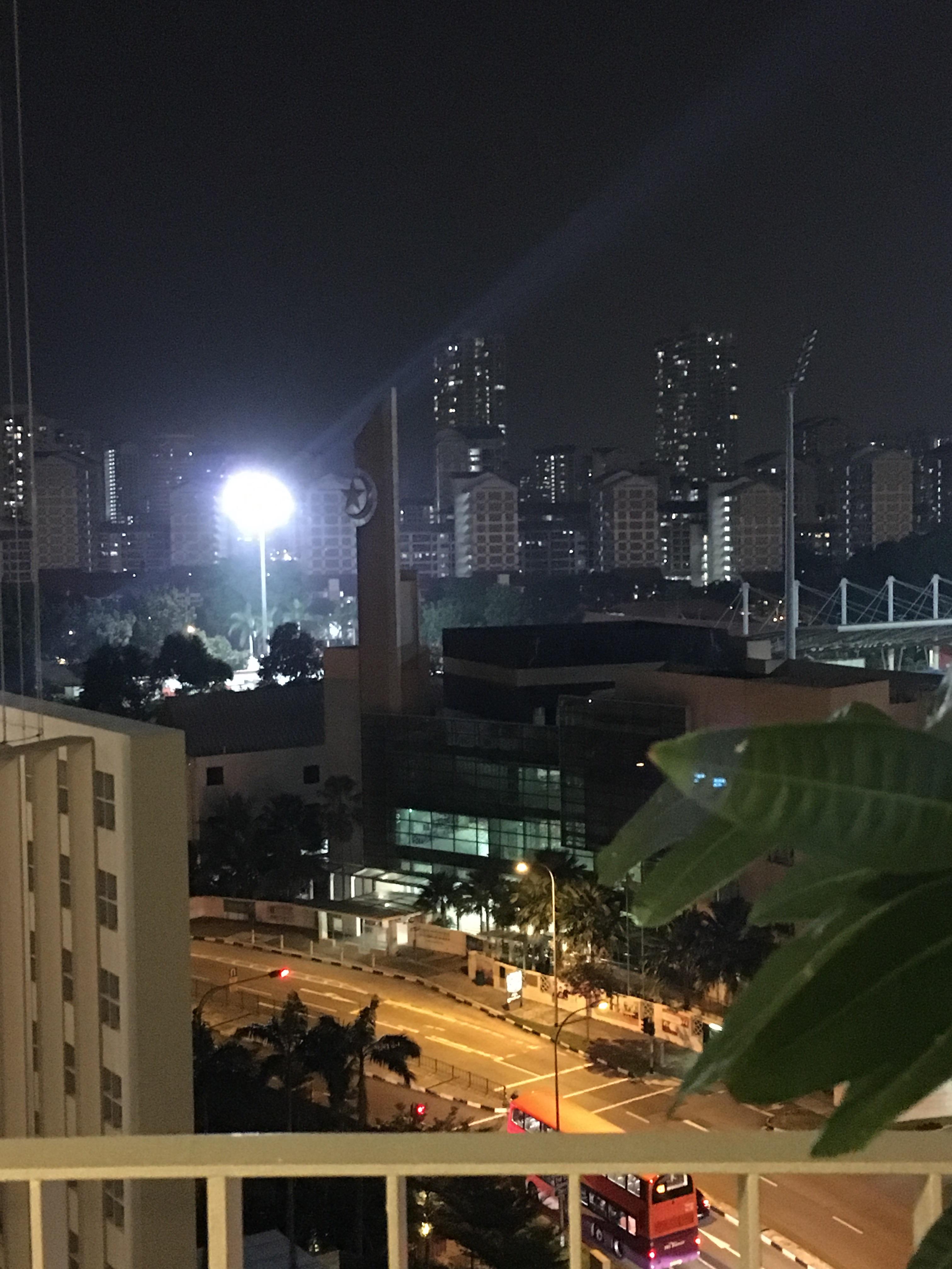 那个大灯旁边有个五角星的标志,就是那个马来教堂,我住10楼,这是客厅阳台照的,就是隔一条马路、但是斜对面。不吵