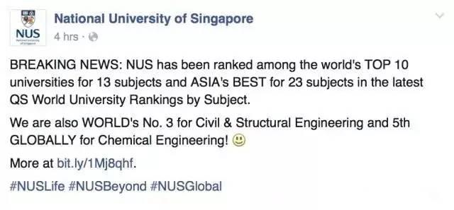 除此之外,在亚洲大学的排行榜上,NUS有25个专业都名列前茅,也比去年的21个专业进步了~