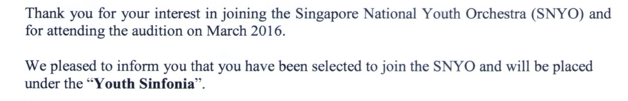 去GEP就没有学校乐团了。ACSJ的乐团老师都说放弃非常可惜,给我们指引了不少可以考虑的方向。请私人老师是一定的,但问题是乐团是具体项目,一个人练是不行的。乐团老师说可以试试SNYO,因为他的水平大约有中学2,3年级的样子。虽然这个水平对SNYO来说还很低,但年龄是他最大的优势。我们就在3月带他去Audition。靠着一点运气,就有了一楼的信。