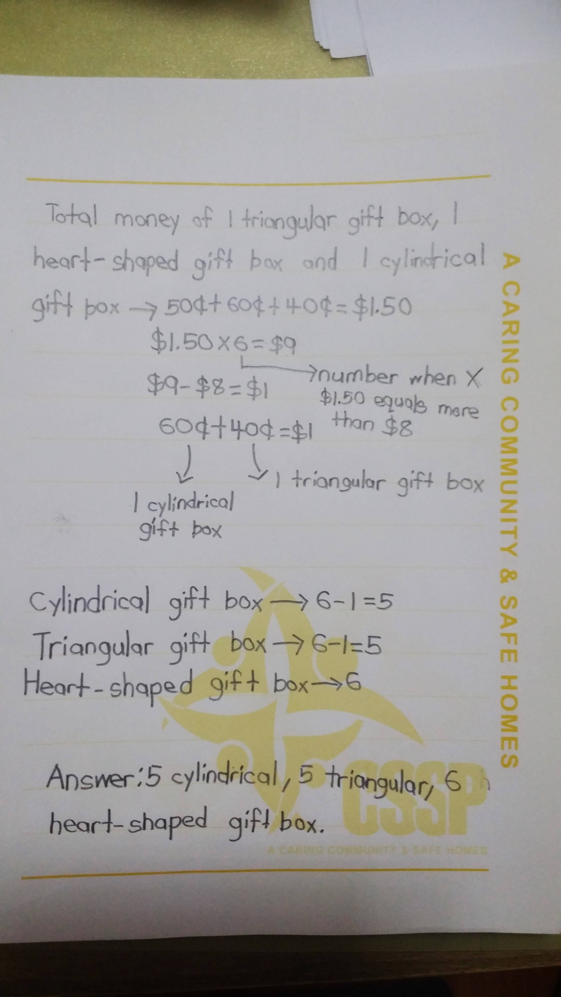 很多种答案用guess and check做。三角加圆柱是一块钱,那么心形卖出的钱必须是整数,心形盒子就必须是双数,三角跟圆柱盒子的数量相同。所以很多组合都符合题目条件。用guess and check做。三角加圆柱是一块钱,那么心形卖出的钱必须是整数,心形盒子就必须是双数,三角跟圆柱盒子的数量相同。所以很多组合都符合题目条件。