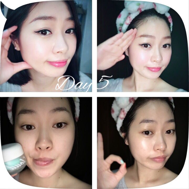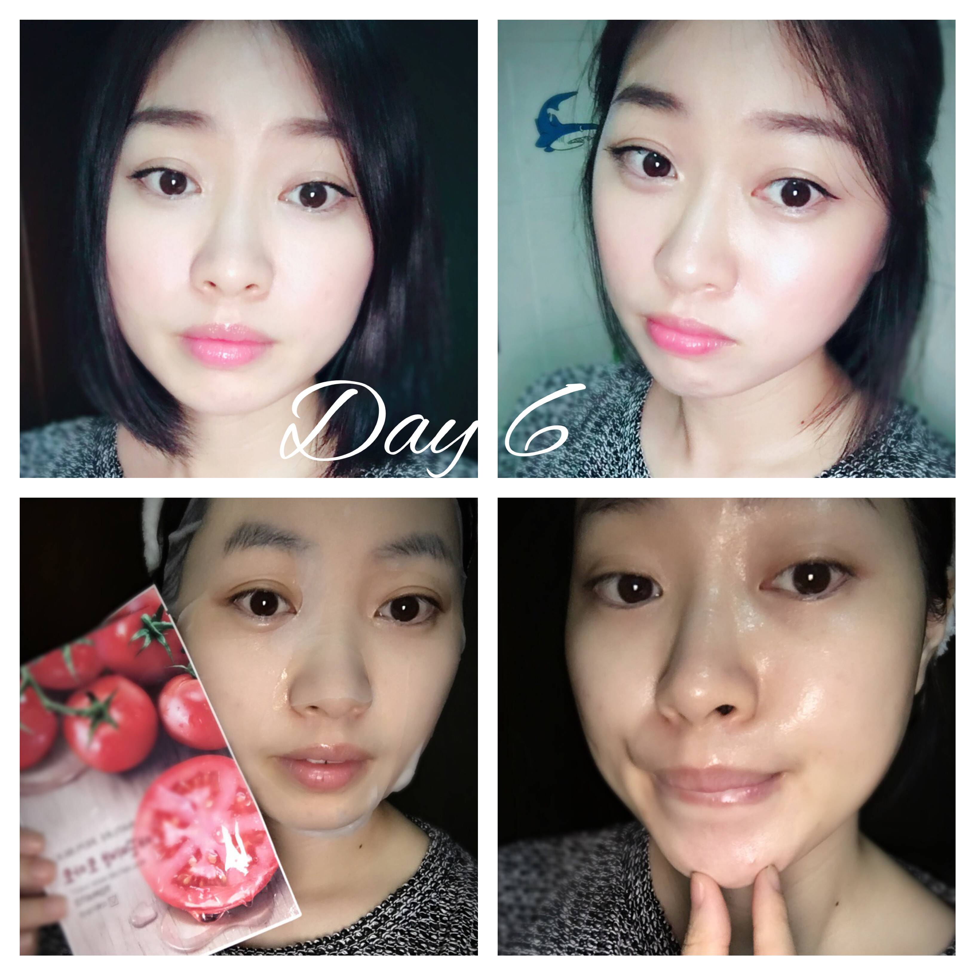 day 5白天上了浓妆,画了平时很少画的全包上眼线,卸妆前除了眉毛被蹭掉了,其它的还算完好。痘痘基本上好了,右边的还是没有完全平整,不过开始上美白淡疤了,本来打算局部擦,结果挖多了,直接抹了整脸。大家可以用美白精华之类的局部擦,我私认为美白产品用完脸都有点儿干,或者不够保湿,所以可以再搭配个保湿水乳啥的。