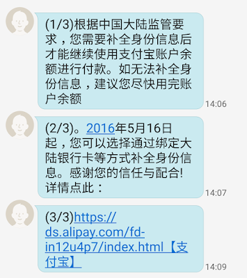 最近,新加坡的支付宝用户们都收到了来自中国支付宝的手机简讯,简讯写道:“根据大陆监管要求,你需要补全身份信息后才能继续使用支付宝账户余额进行付款。如果无法补全身份信息,建议您尽快用完账户余额。2016年5月16日起,您可以选择通过绑定大陆银行卡等方式,补全身份信息。”
