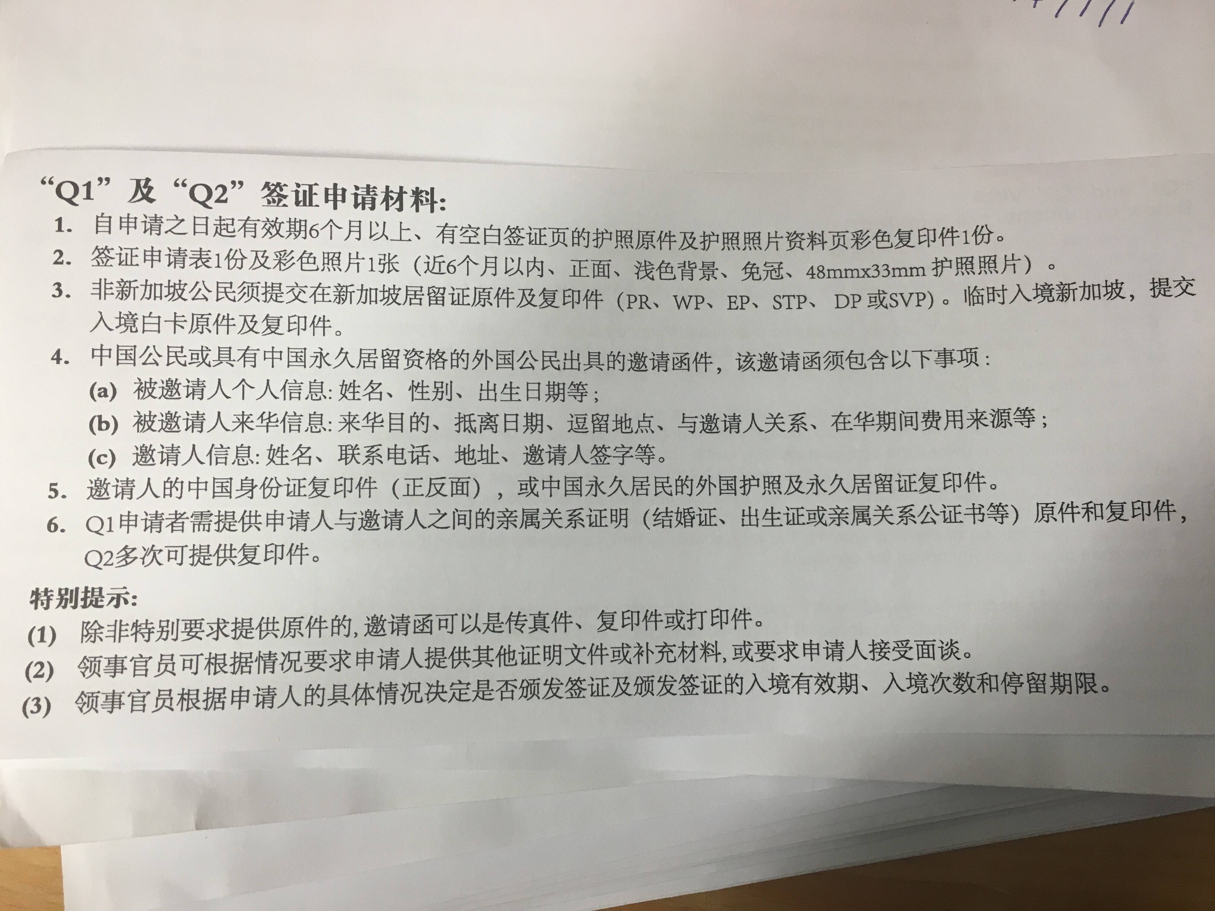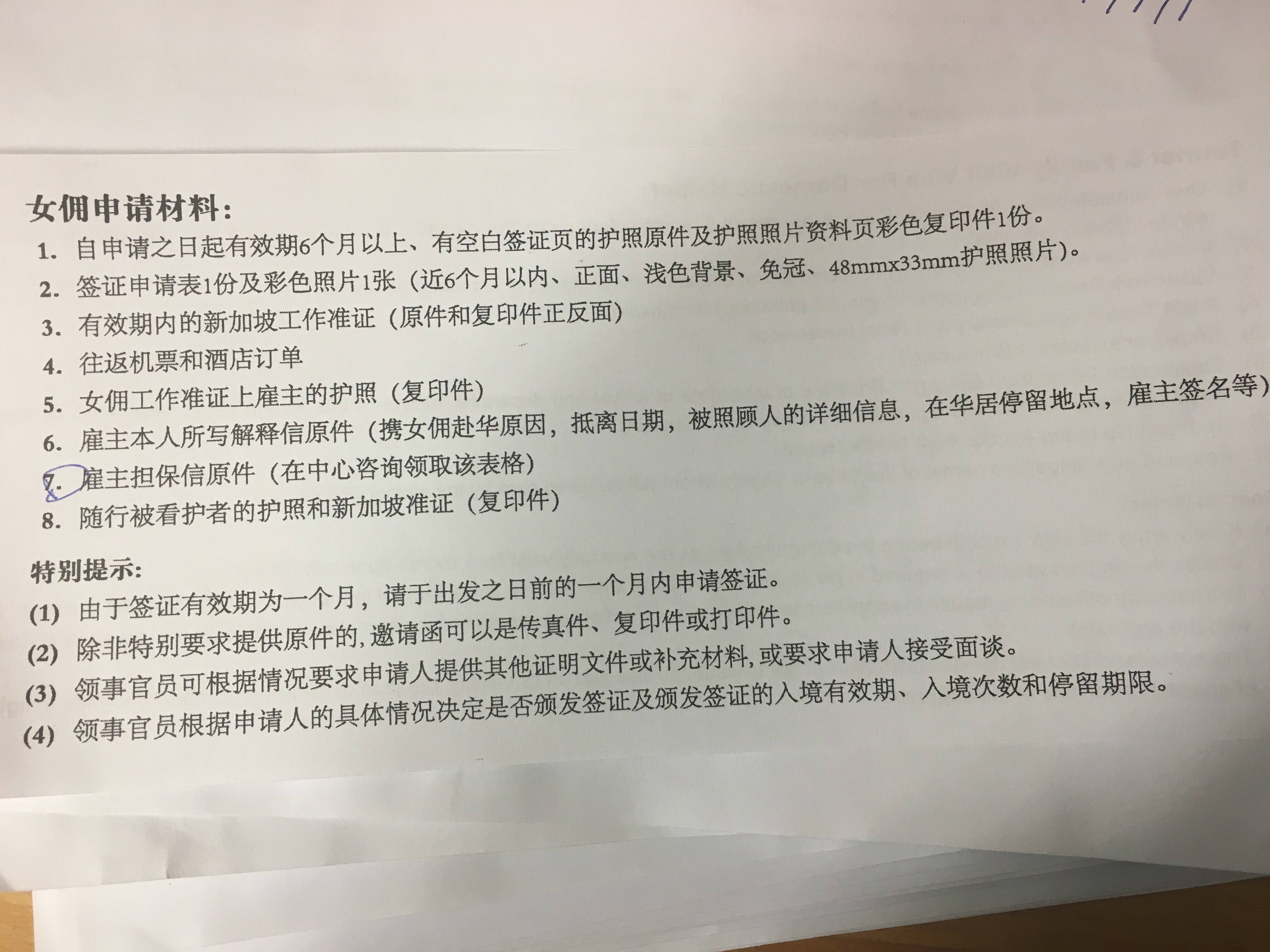关于申请中国签证所需资料(女佣及新加坡孩子)