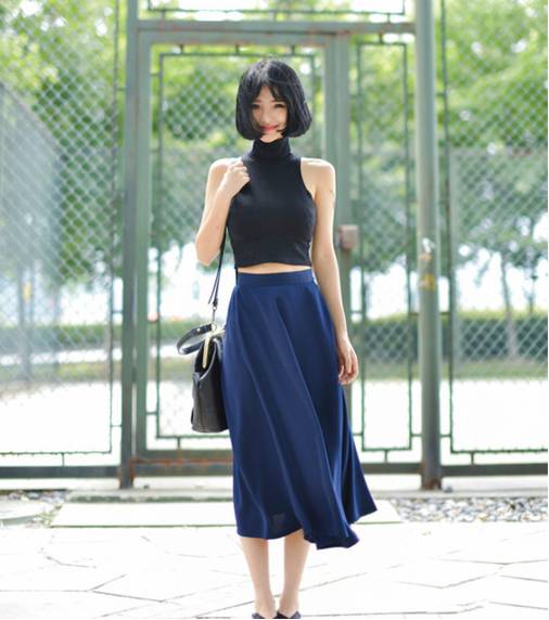 雪纺衫或纯色T+伞裙是突出甜美气质的一大要义。