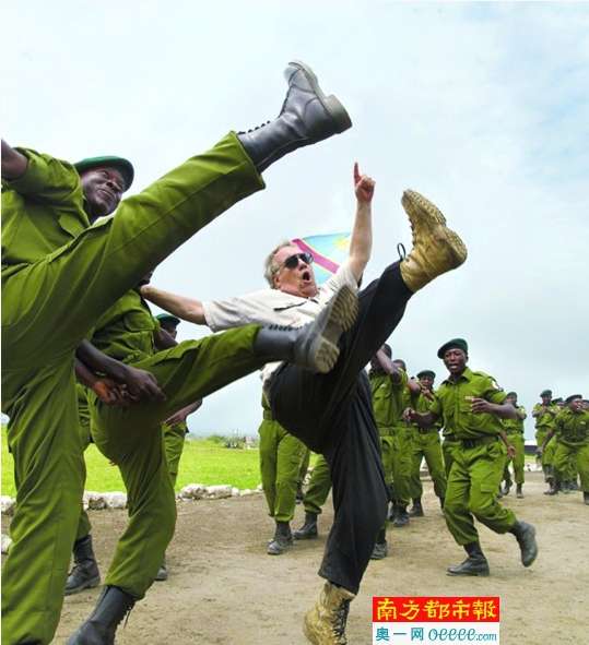 霍华德·巴菲特2013年访问刚果民主共和国时和刚招募的护林员一起跳舞。