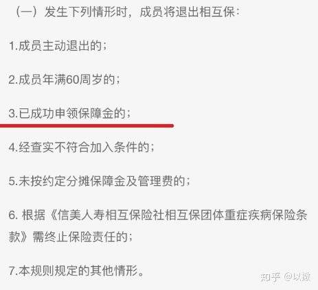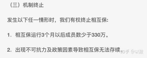 第三,项目随时有终止风险,条款里也列举了各种可能终止项目的情况,因此要做好最坏的打算。所以最好不要把相互保当作真正的保险产品,可以把它看作一个“互助会”,缴费时间越久,并不会给你带来更多好处,照目前条款来看,不会有分红,更低保费之类的福利。相反,一旦遇上患病人数过多之类的情况,就有可能因为成员退保等原因终止项目,也意味着已经缴纳的费用都打了水漂。