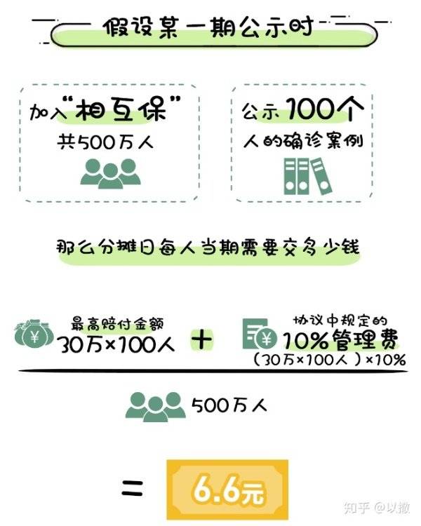 比如,当参与总人数为330万时,这个时候每个案例的分摊费用是0.1元。假如当月分摊日有100个人获得赔付,那么当期每位成员分摊的费用是100X0.1元等于10元,当月的相互保支出即为20元。