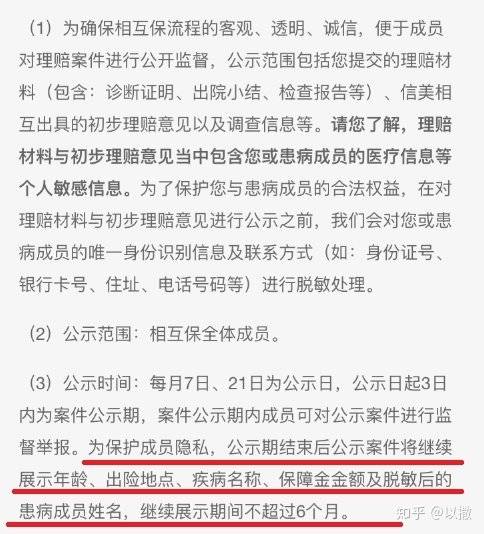 在相互保里申请赔付,是需要把你的各种材料进行公示的,接受监督举报,这可能会包括一些敏感的内容。而患病者的唯一身份识别信息,包括身份证号,住址,电话号码这些,虽然宣称说会进行一定的脱敏处理,但是显然,实际上这部分也是要公示的。
