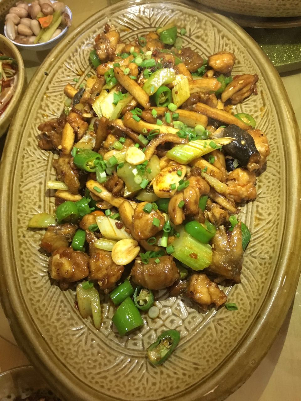 这个是豆干香麻鸡。鸡肉炒得很嫩。豆腐干我就不说了,湖南人都喜欢吃豆腐干。其实我觉得他家的炒菜明明都是湘菜的炒法,因为没!有!花!椒!最讨厌花椒了,吃到花椒整个人都不好了。 配菜的大辣椒和芹菜,明明就是湘菜!!!既然是湘菜口味我自然要给10分。