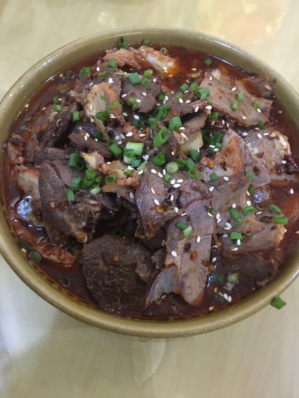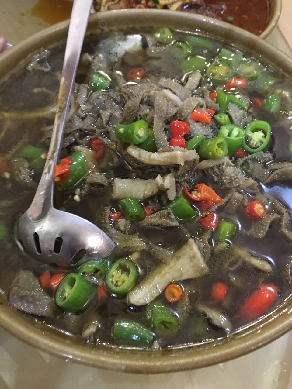 椒香草原肚。这个就是牛肚拉,不知道怎么做的反正味道特别好怪我咯。现在想想貌似是肉桂的味道很重,果然适合我这个肉桂控。底下还有好多粉条!!!粉条!!!粉条比粉丝粗!!!也特别好吃!!!10分!