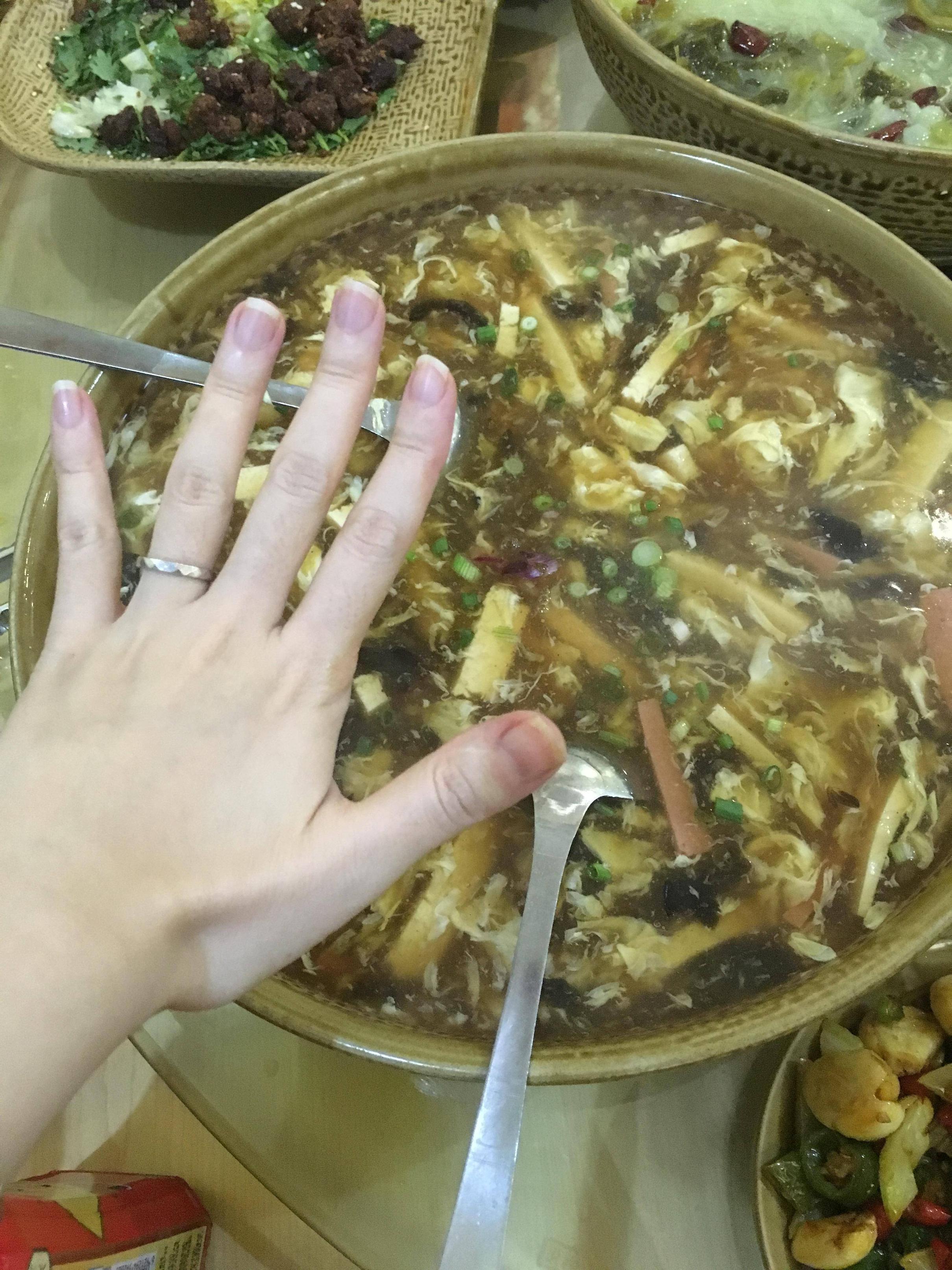 最后的最后,是一碗巨大无比但是有股隐约的怪味的酸辣汤。据老板说是那个醋有种特别的味道。但是反正我不爱喝这个。好像坡上翡翠阿还是哪家中国菜的店里也有类似的酸辣汤,我都不喜欢喝。所以8分。可以PASS的汤。