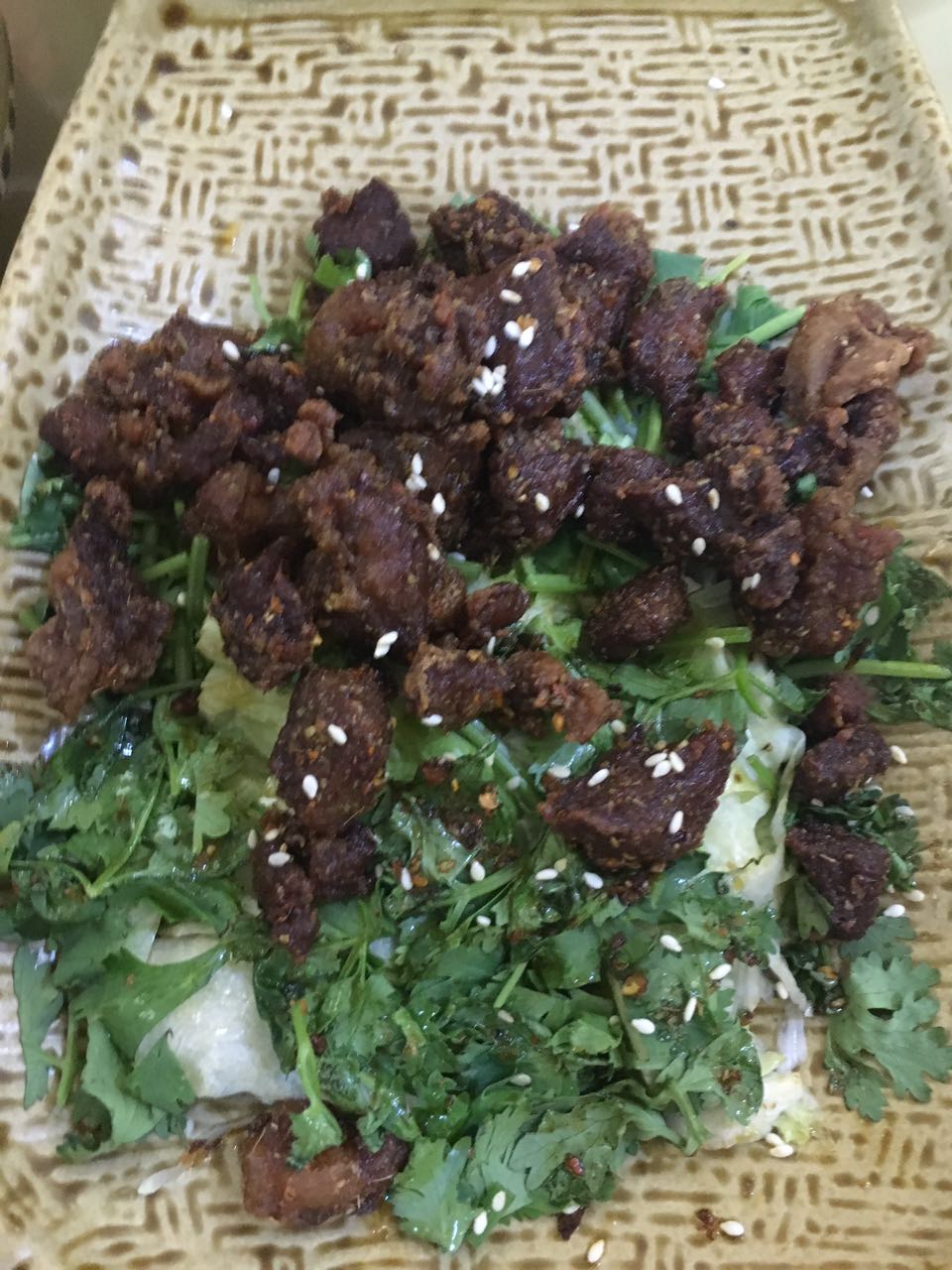 籽然羊肉。其实我很喜欢孜然的,非常喜欢,特别喜欢。可是我不喜欢羊肉。羊肉那个味我都不喜欢。所以我只吃了小小一坨,然而羊肉的味道还是很重。所以就9分。