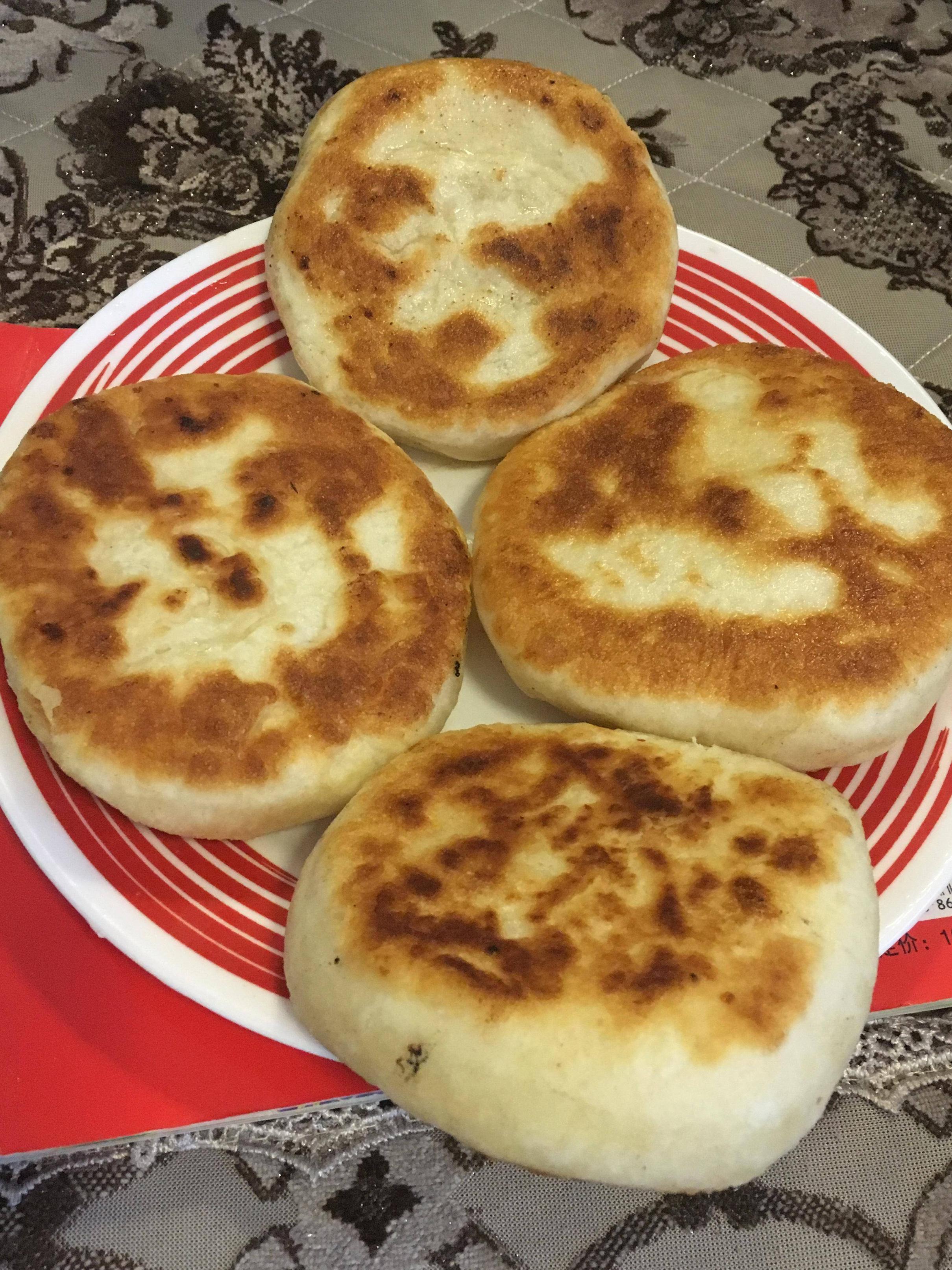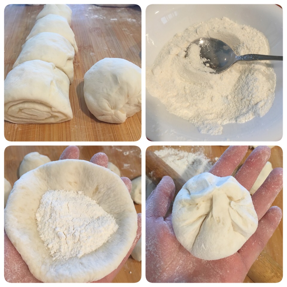 切好的饼剂,两边都封住,然后按扁擀成饼状,包入糖馅儿,再像捏包子一样捏住,这个远没有捏包子复杂,反正捏住就行,不追求样子,之后再擀扁成饼状,准备开烙