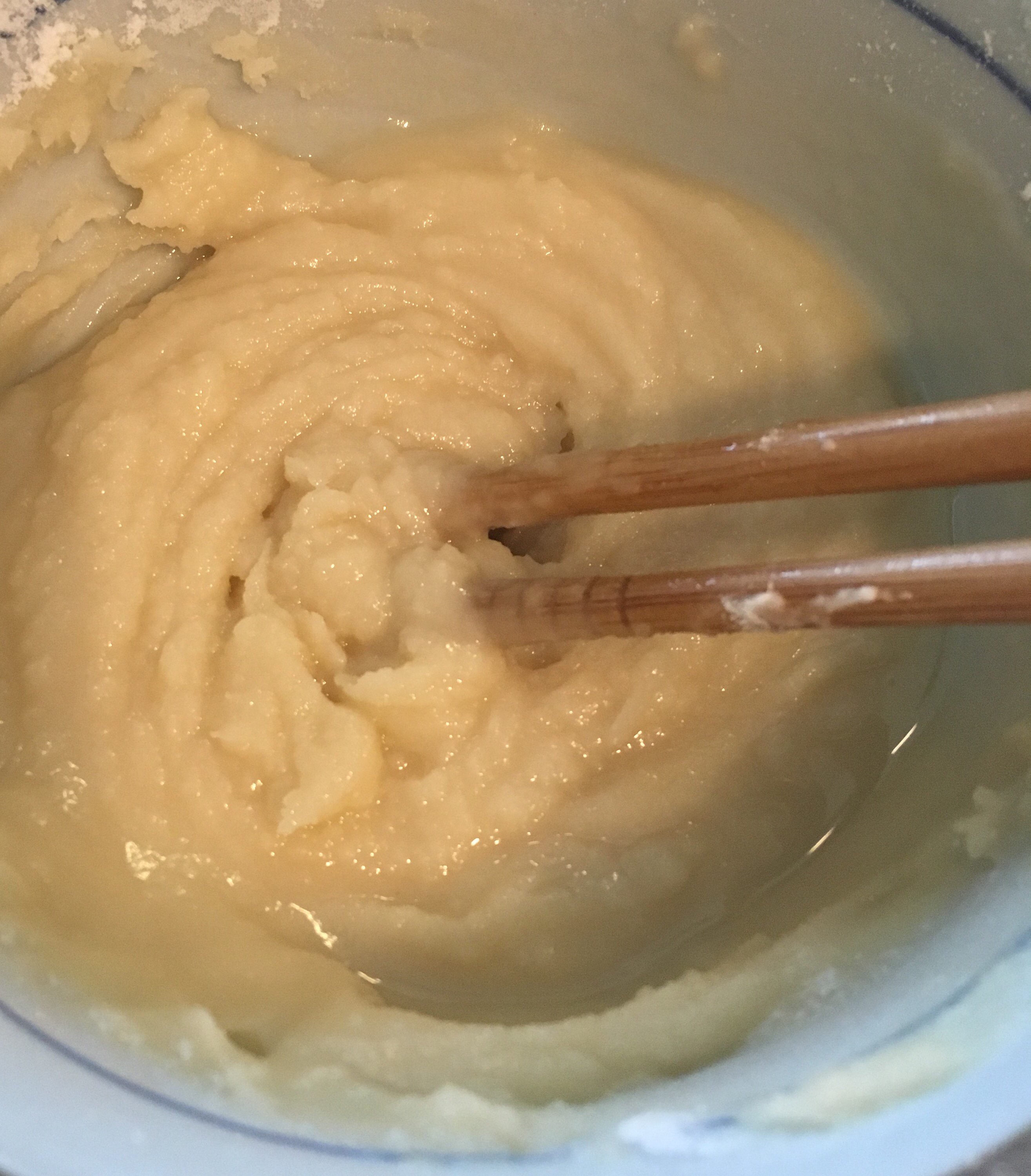 第二步,准备揉面之前做好油酥,家里没有猪油,普通炒菜油也可以,取小半碗面粉,烧热油,把热油倒入面粉,滋滋啦啦响,把油和面粉拌匀成比新加坡大桶酸奶略稠的状态。面油比例自己把握。