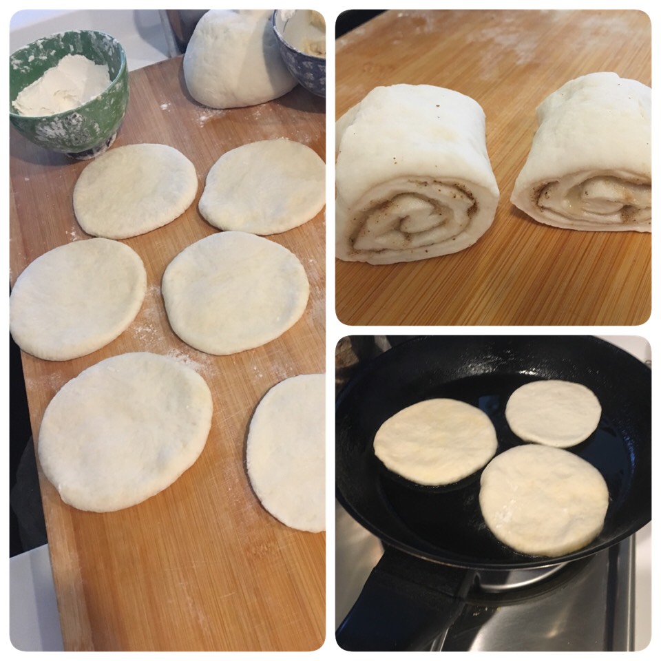 老公习惯吃咸口,我另留出一块面团在抹完油酥没卷起来之前均匀撒上椒盐和少量五香粉,之后卷起来切段,省略包糖馅儿这一步,切段封口后直接擀扁成饼状准备下锅