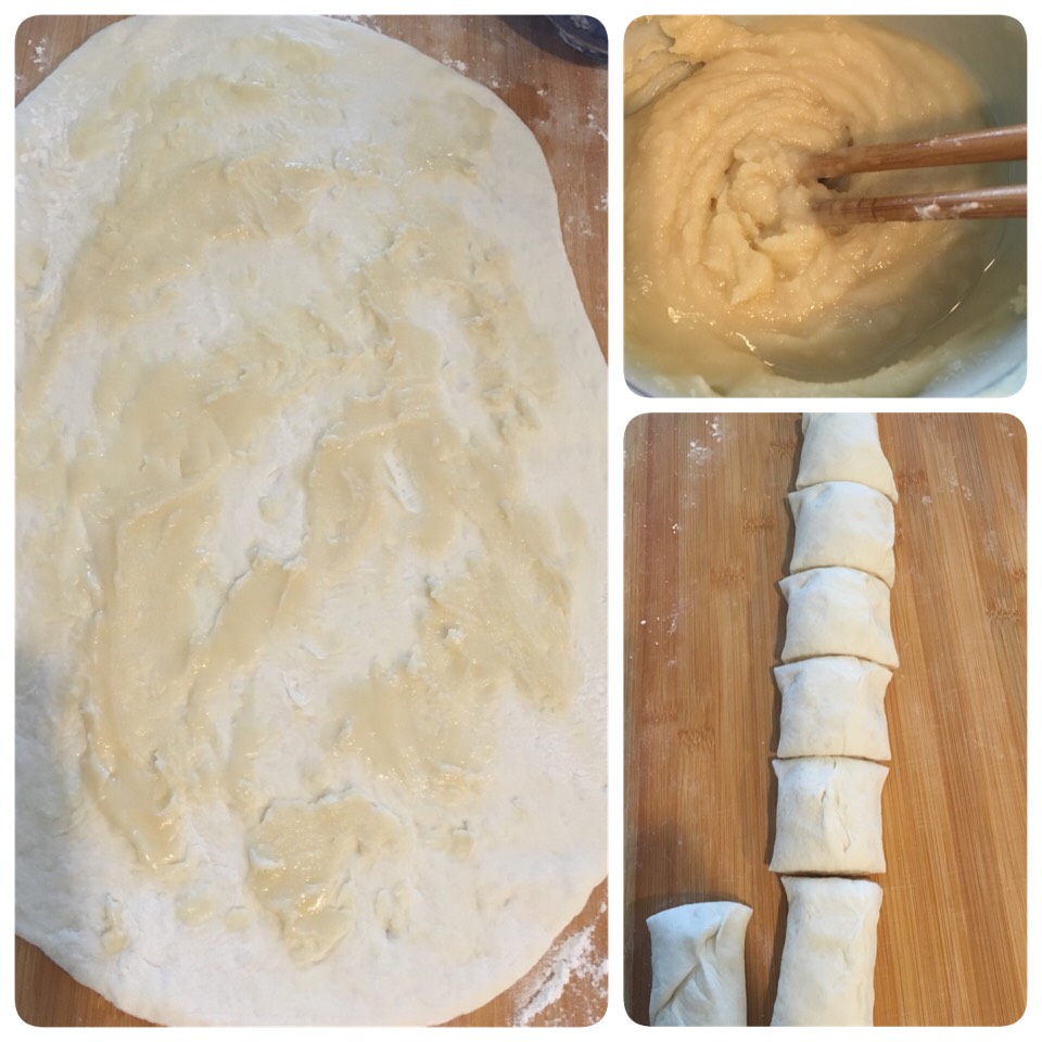 抹匀后卷成长条,两边封住,把长条切成几段,想吃大饼切大段,吃小饼切小段。