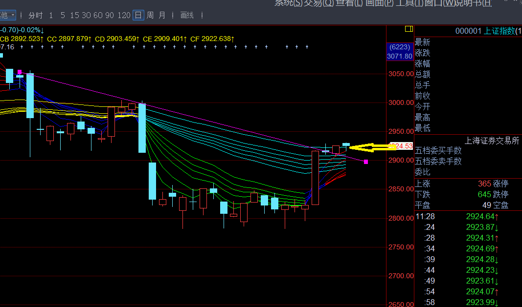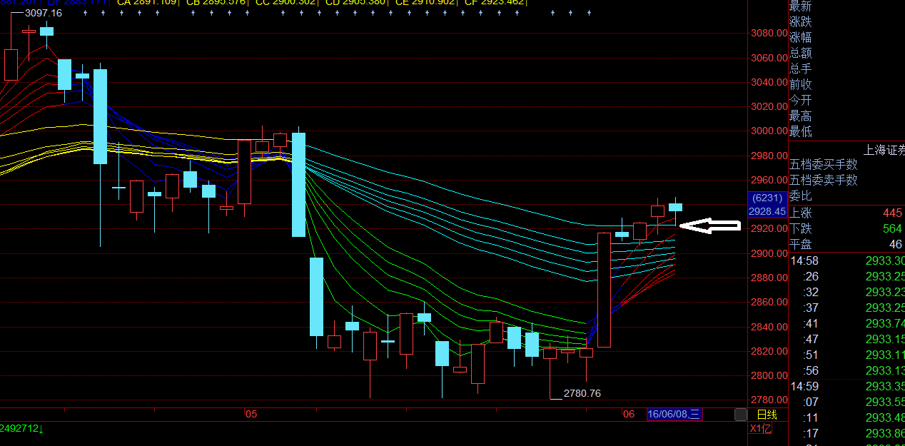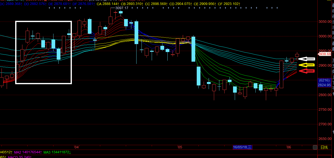 上图为上证综指的日线图。根据顾比均线,由上到下,多方至少有三个防守阵地:CF(2923点左右,白色向左箭头),CD/CC(2905点左右,黄色向左箭头)和CA(2888点左右,红色向左箭头)。
