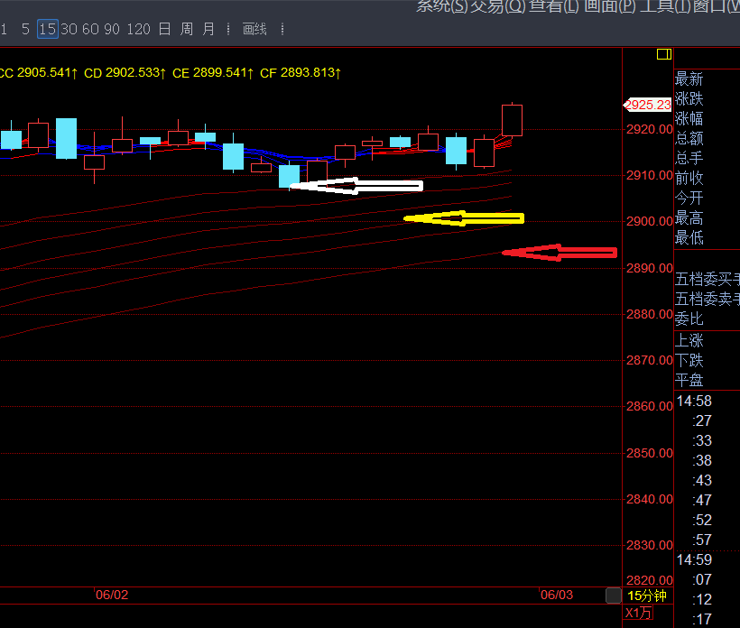 下图为上证综指15分钟K线图,此时已转为上升趋势。下面那一组六根红色线表示长期投资线,从上到下分别为CA到CF。股价下跌时,分别有CA(白色箭头)、CC/CD(黄色箭头)和CF(红色箭头)三个阻力位。