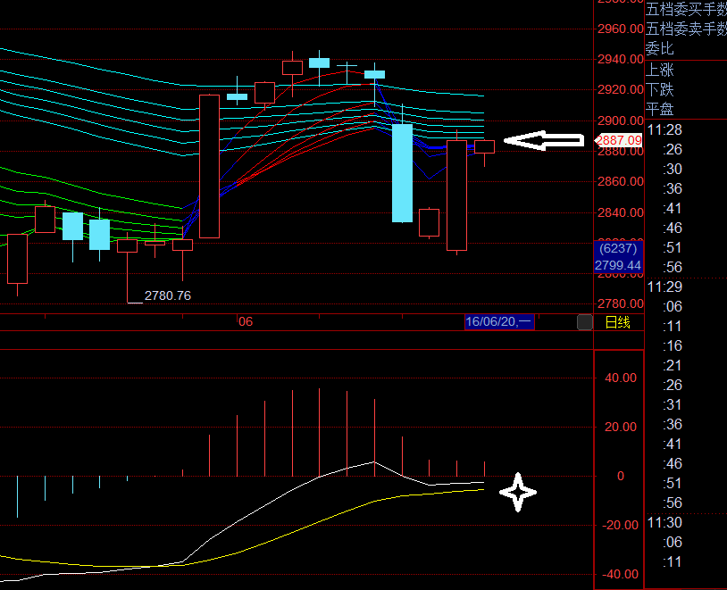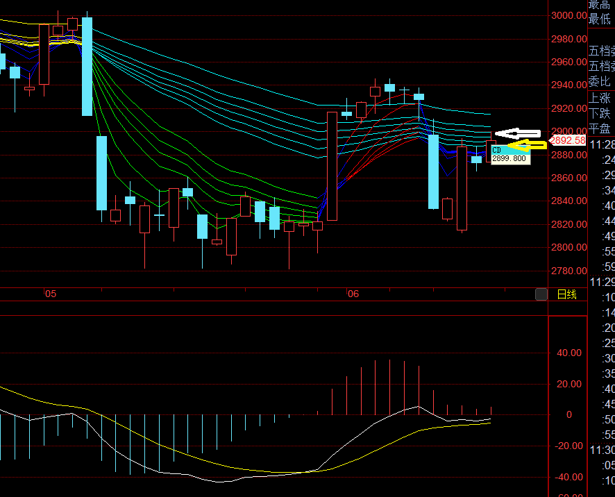 收盘的2887.21无限接近2888。前几天来本贴交流过的朋友都对2888这个数字非常熟悉。我几乎每天都要提及CA=2888(下图为上证综指日线图,白色向左箭头)这个关口。不过,前几天它还是多方的重要支撑。但周一失守后,多方一败涂地,CA=2888被空方控制。如今,它则成为空方阻挡多方的第一道日线大关。