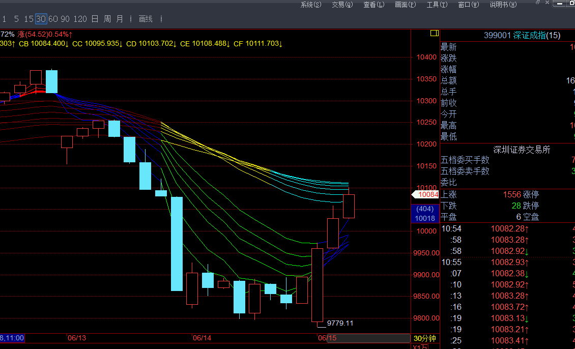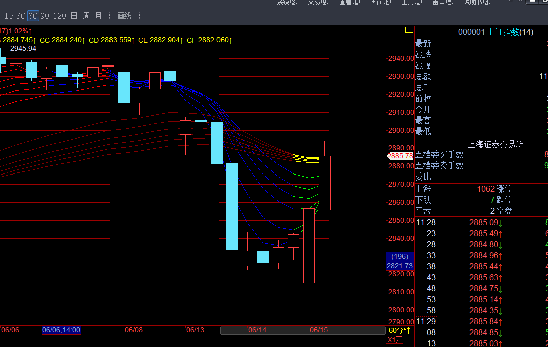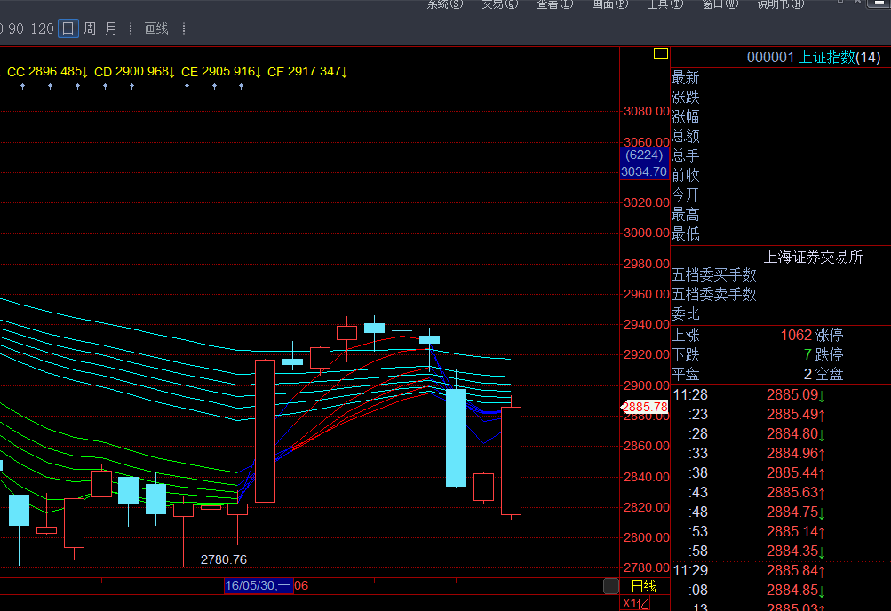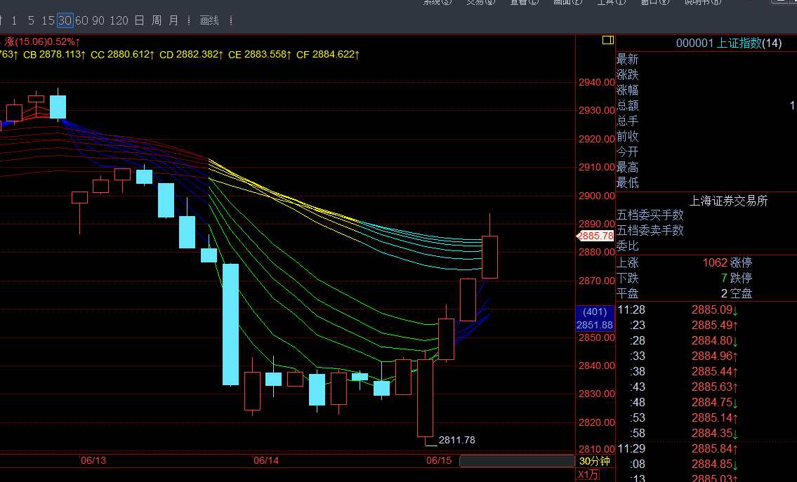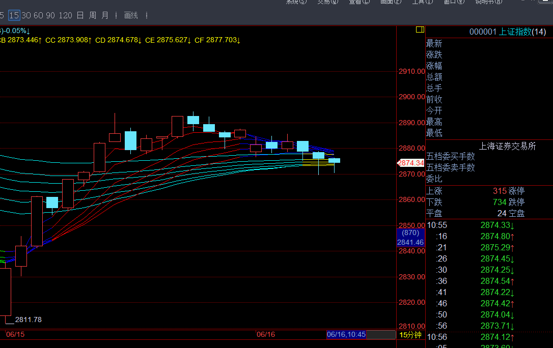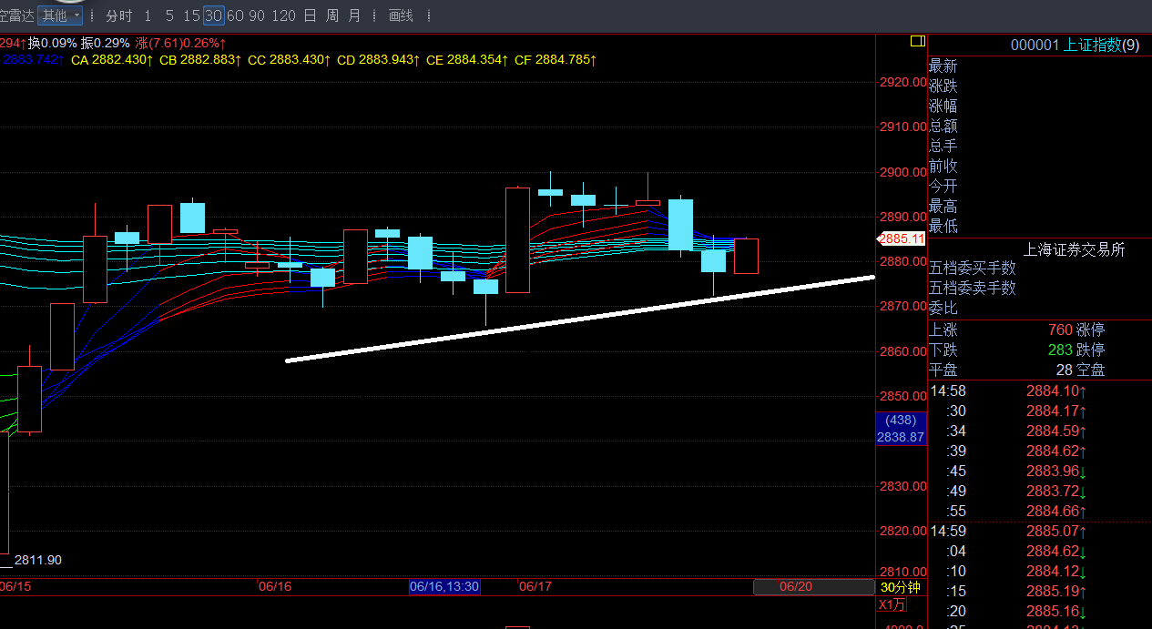 大盘总是令我失望。午盘仅只开盘一瞬间逼近过CA=2888一次(最近达2887.74),便逐渐后撤,再也没有机会靠近。全天大部分时间是在顾比均线的15分钟支撑上运行,收盘前半个小时被挤到支撑之下。