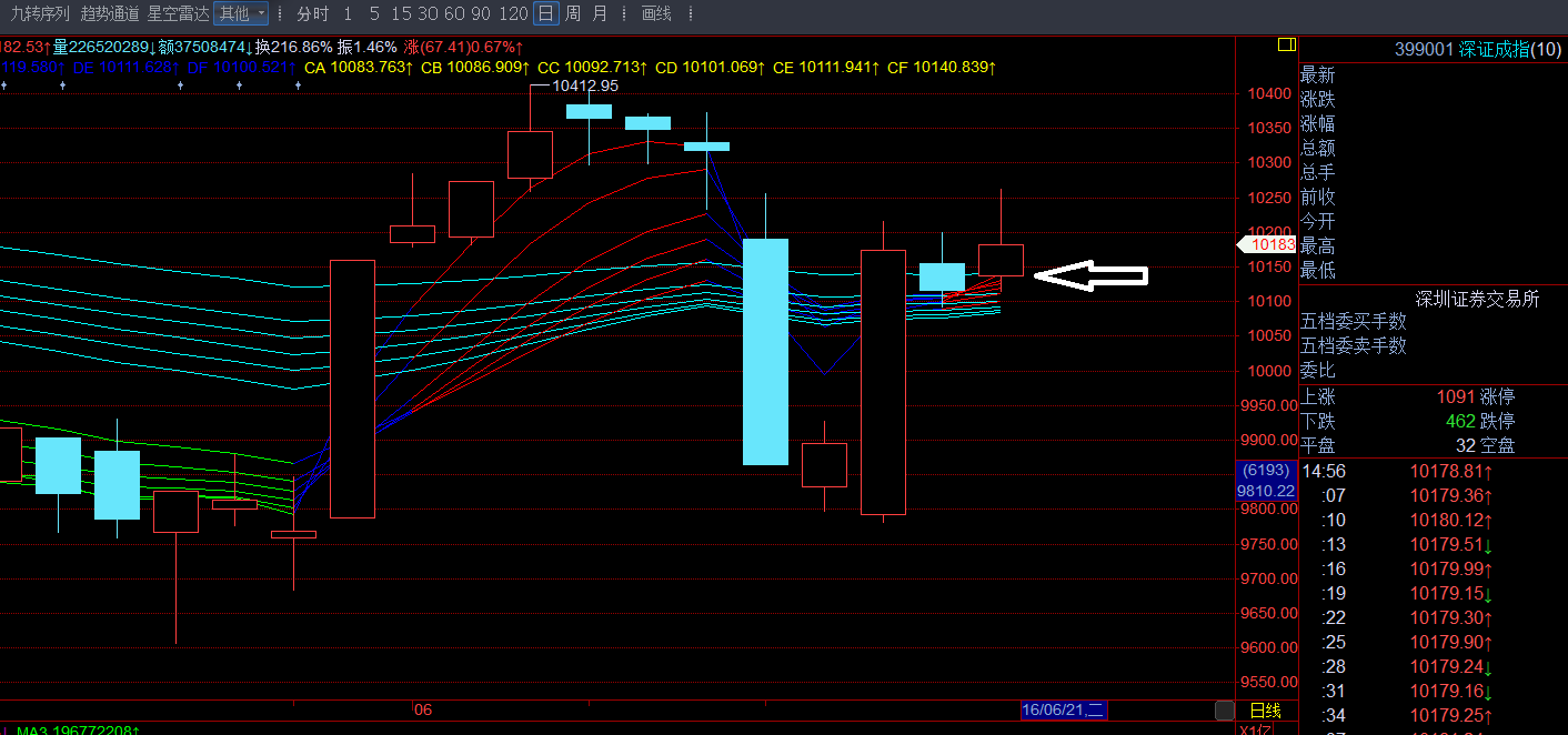 如上图所示,深证成指位于CF=10180关上,支撑作用明显,想下来有些难。