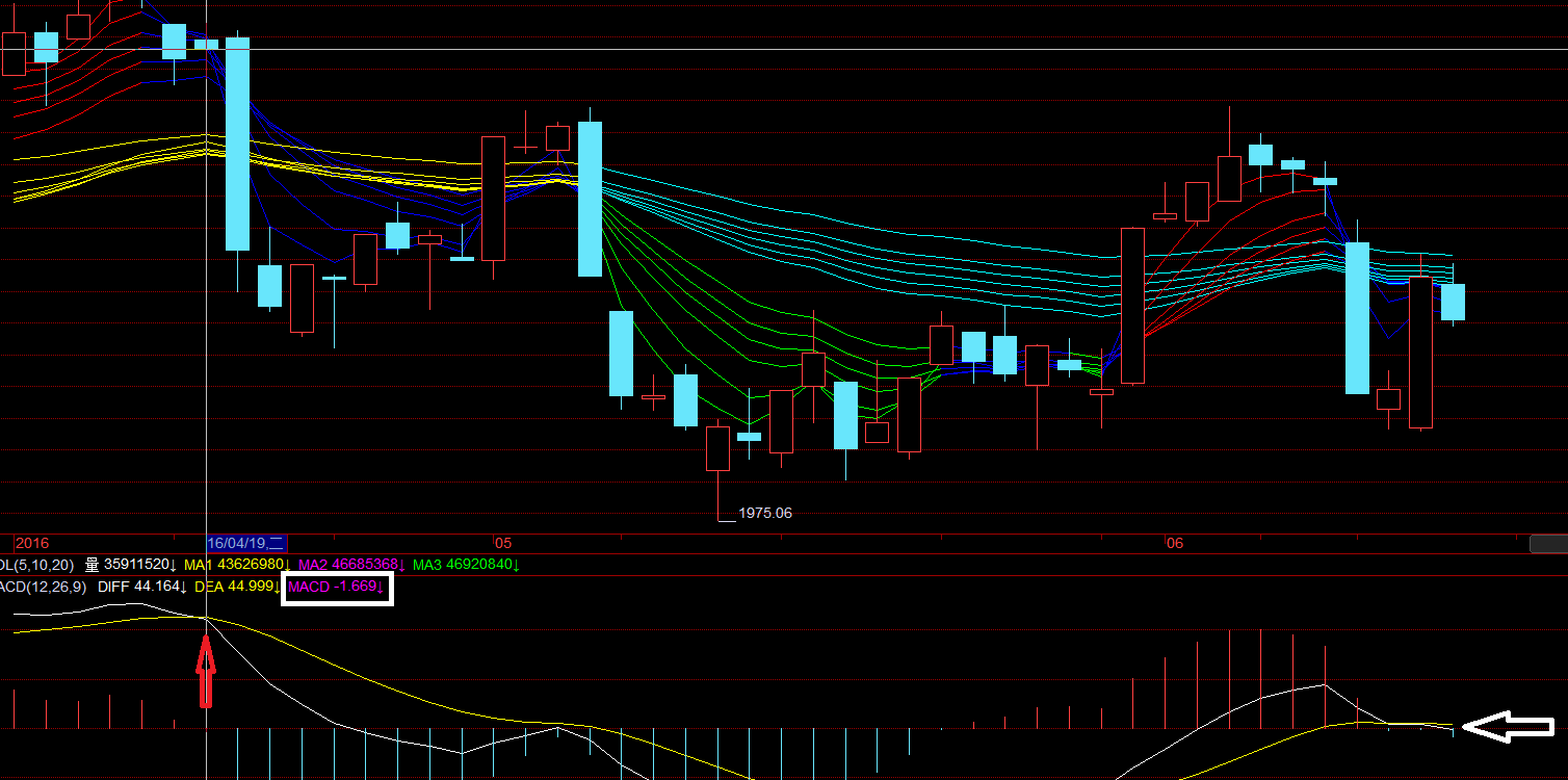 如果再往前看,4月20日的大跌前一天(4月19日,上两图红色向上箭头),上证综指MACD白线尚未下穿黄线时,创业板MACD的白线已下穿黄线(白框内为MACD值,创业板为负数,上证综指为正数)。