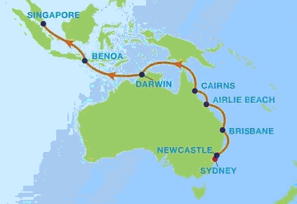 时逢南半球大洋洲的春夏之交,我们乘坐了两个游轮共29天游览了澳大利亚和新西兰。第一个船是Celebrity Solstice, 从悉尼出发,经墨尔本,沿新西兰东南海岸绕行南北两岛,12天到达奥克兰。第二个船是Celebrity Millennium, 从悉尼出发,沿澳大利亚东北海岸,经印度尼西亚17天到达新加坡.这两艘船我们以前分别在地中海和阿拉斯加都坐过,这次船上就算是故地重游了,真正感兴趣的是澳大利亚和新西兰的海岸风光。说是29天,但船在悉尼、凯恩斯(大堡礁)和新加坡都是stay overnight, 实际航行大约26天。