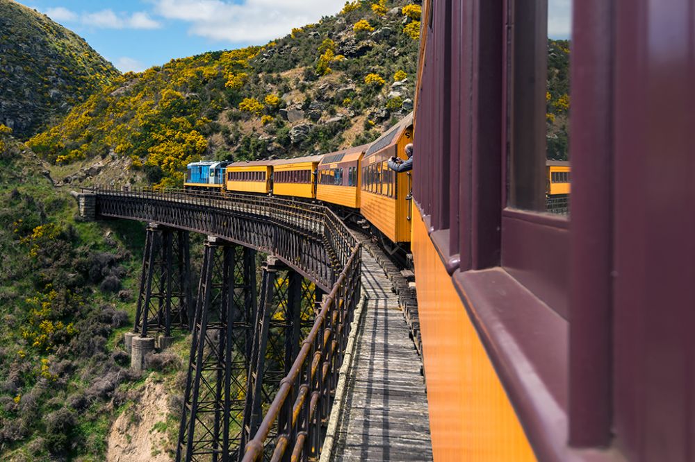 12。在南岛东南端的Dunedin, 我们乘小火车观赏了风光秀丽的 Taieri Gorge 峡谷,漫山遍野开满了春天的黄花。