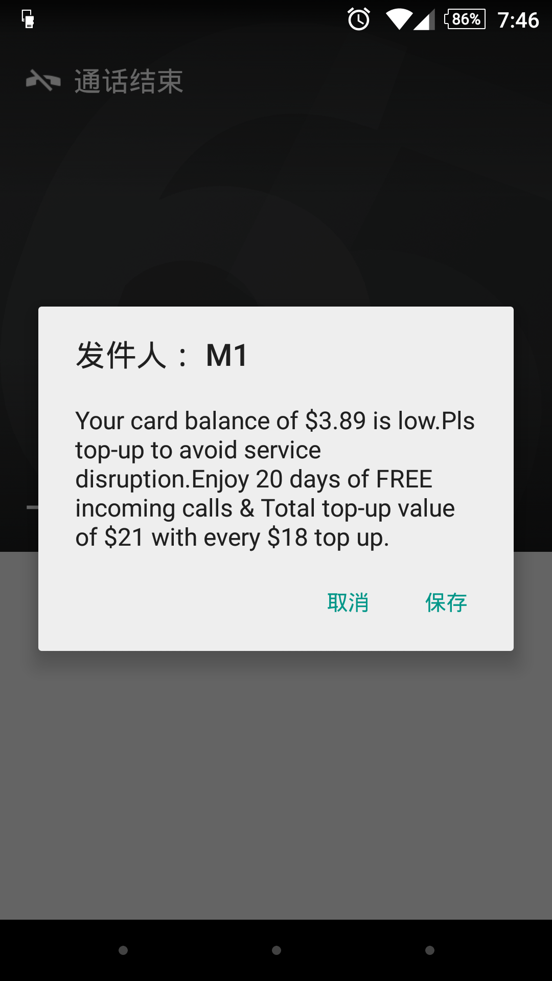 你试试还能用不?我觉得应该可以,只是叫你提早点加钱,以免不够吧。 如果真的不能打了,打去客服问问,M1客服不错的。我觉得应该可以,只是叫你提早点加钱,以免不够吧。 如果真的不能打了,打去客服问问,M1客服不错的。