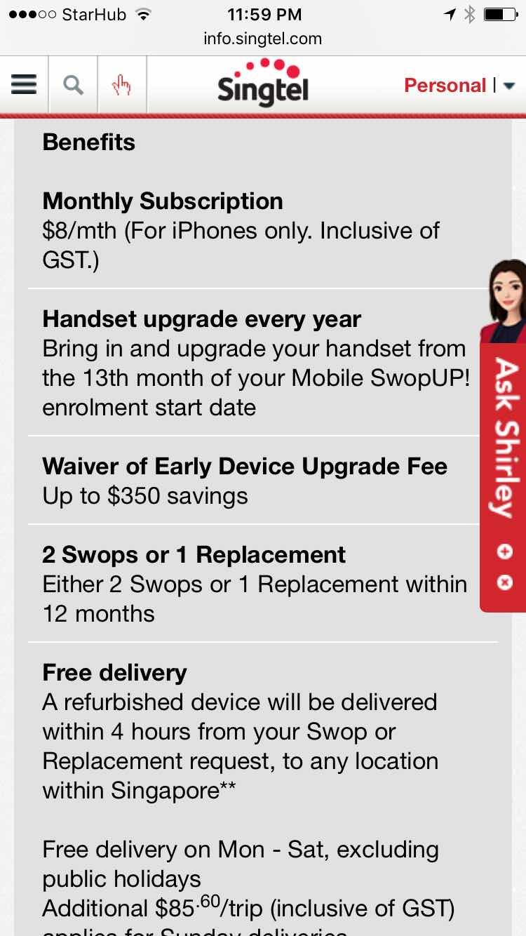 然后又过了几个月 手机听筒出问题了 我就想着马上满一年了 坚持一下换新机 ,结果打电话过去咨询。客服态度极差 说根本没这个服务 我理解错了 我说你们官网上都还写的清清楚楚 我要求主管给我call back ,主管又说一年以后换新机可以。但是要交新机的钱 ,并且还旧手机回去 并且还要再买一年swop 免得只是upgrade fee 350新。我说那不就没有任何benefit了么 我的旧手机都不只350 。主管说singtel给了你们benefit 巴拉巴拉说一堆没用的 而且态度极其傲慢