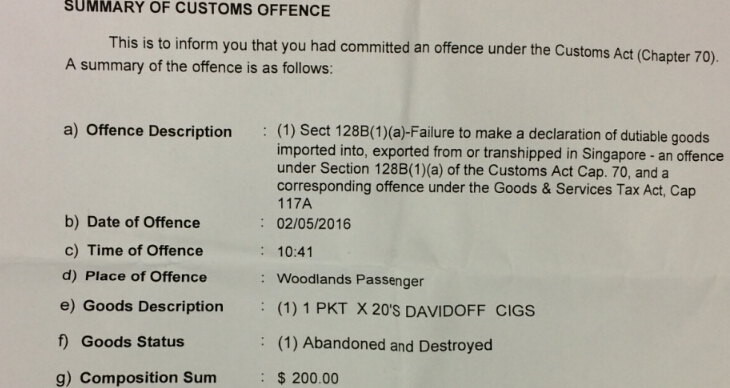 带一包烟过海关未申报,被罚款200,领到了一张 "Summary of Customs Offence".