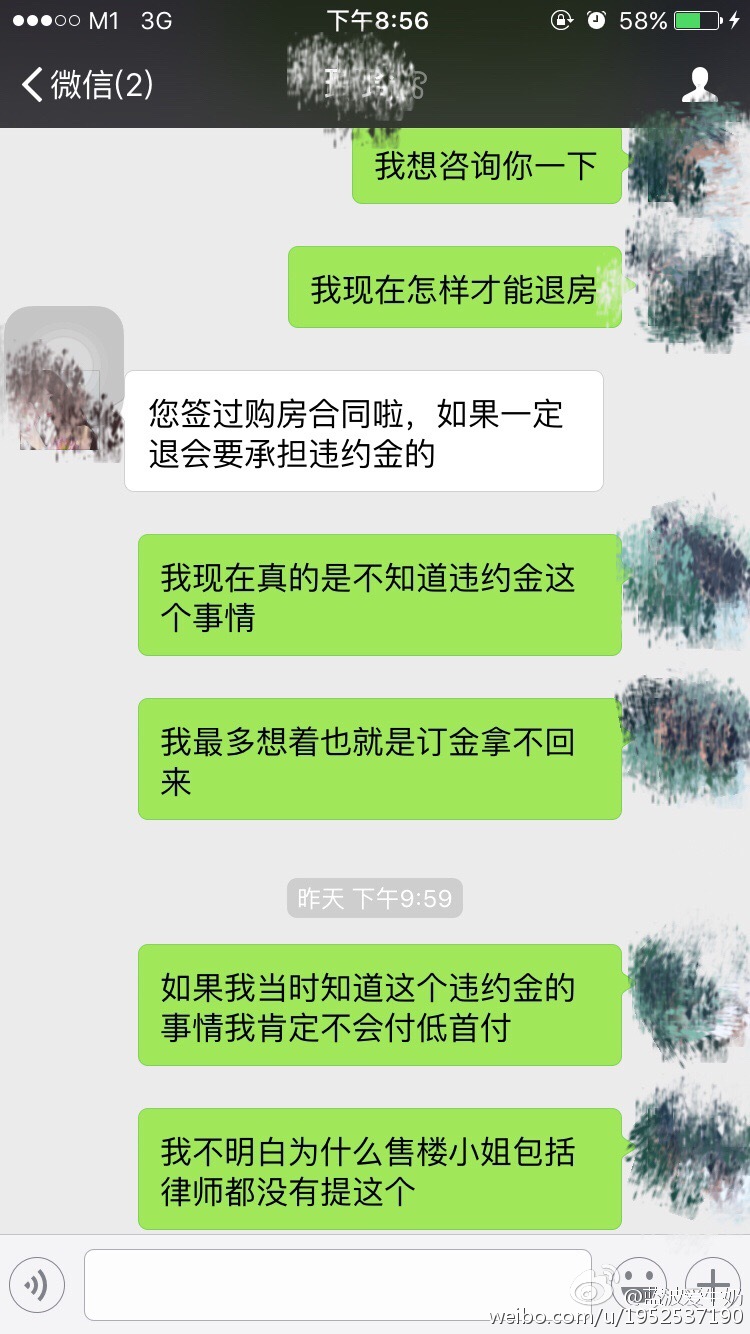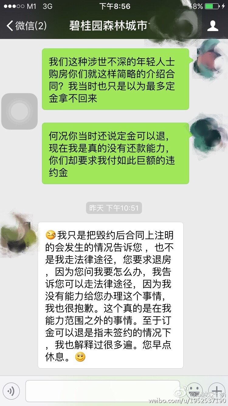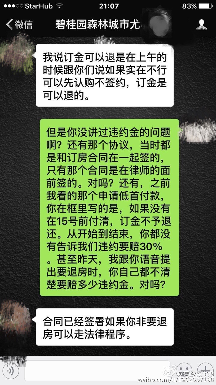 当然我们承认真要走法律途径的话我们是理亏的,一个20出头刚走出校园的毕业生,刚拿到一份工作,对购房法律以及合同都不了解,说白了就是法盲,那你让我们如何去应对经验丰富,巧舌如簧的房产销售员的洗脑呢?这其中他们到底有没有规避其中合约的重要条款,有没有真正跟买房者交待所有的利害关系呢,例如违约金,退房。这些他们可以否认,可以讲他们一一解释过,更可以讲他们没有逼我们签字,是我们自愿的,但事实上,这就是一种变相的诱导,然而这些只有我跟我朋友这两个受害者才知道.