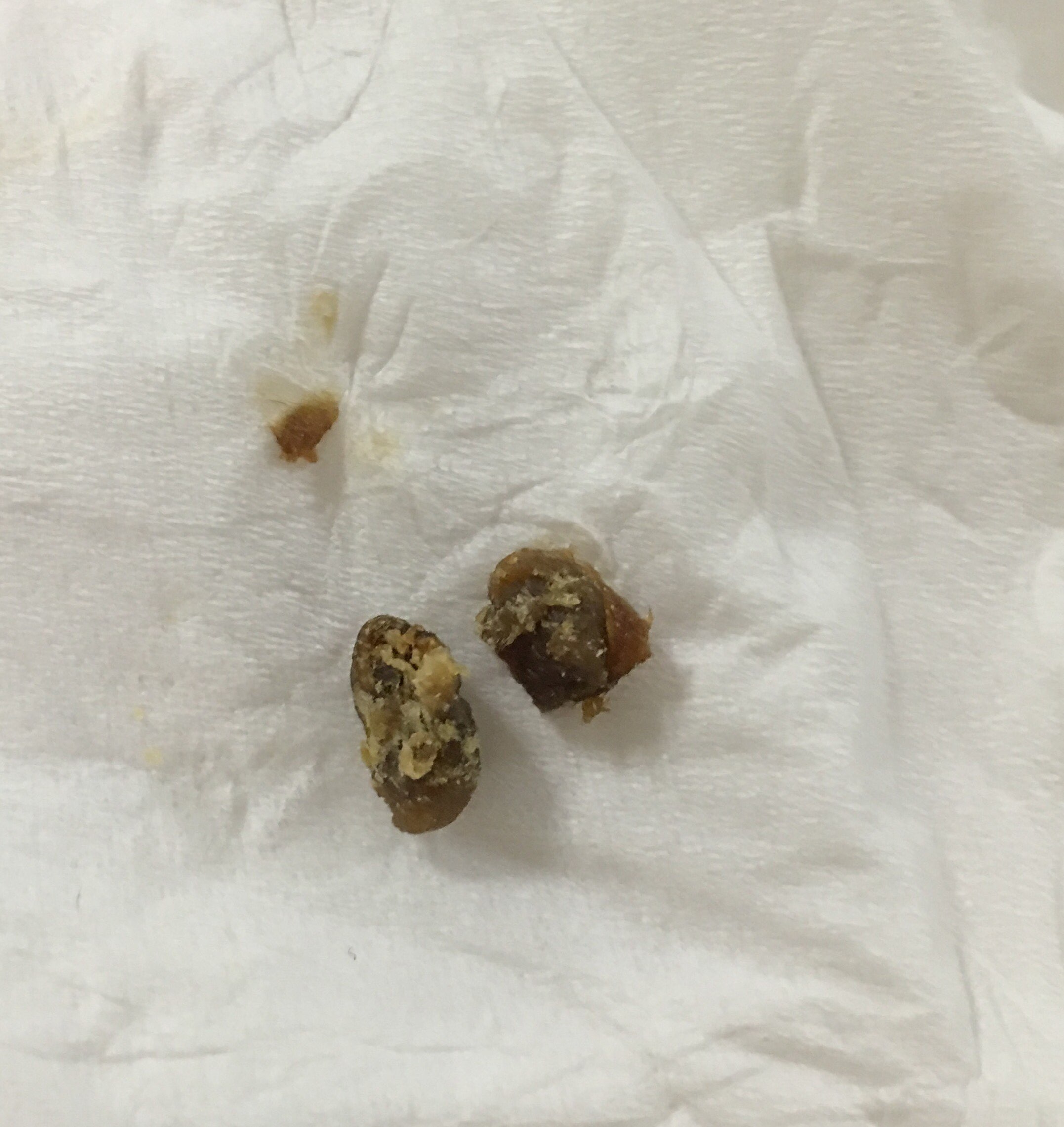 昨晚看帖之后也看了下我家宝贝的用手机灯一照也发现里面有个大耳屎堵着,正好家里有个发光耳勺,从来不会掏耳朵的我立马给娃下手掏起来了,因为目标太明确了,三两下就出来了,一边比较干燥很快就掏出来了稍微用力一点,另一边比较潮湿,有点粘耳朵上,掏出来一看,超巨大的两粒耳屎,而且比较湿润,我感觉再不掏出来留在耳朵里也不太好,堵着外面要是耳朵进水潮湿的环境估计耳朵容易发炎什么的,附我家娃储存了整3年的巨大耳屎!