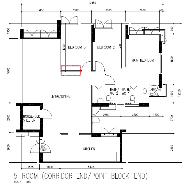 LJN • • 46953 次浏览Resale 5房式组屋(floow plan请见图一), 想在一间普通房(Bedroom3)和饭厅(Dining room)之间的那堵墙(图中红色方框)上面敲出一个玻璃窗。 这样做的目的是白天饭厅有点暗, 想改墙为玻璃窗使得光线能从普通房透到饭厅。