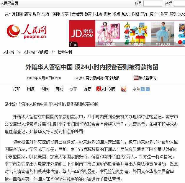 外籍华人留宿中国,需24小时内报备否则被罚款拘留