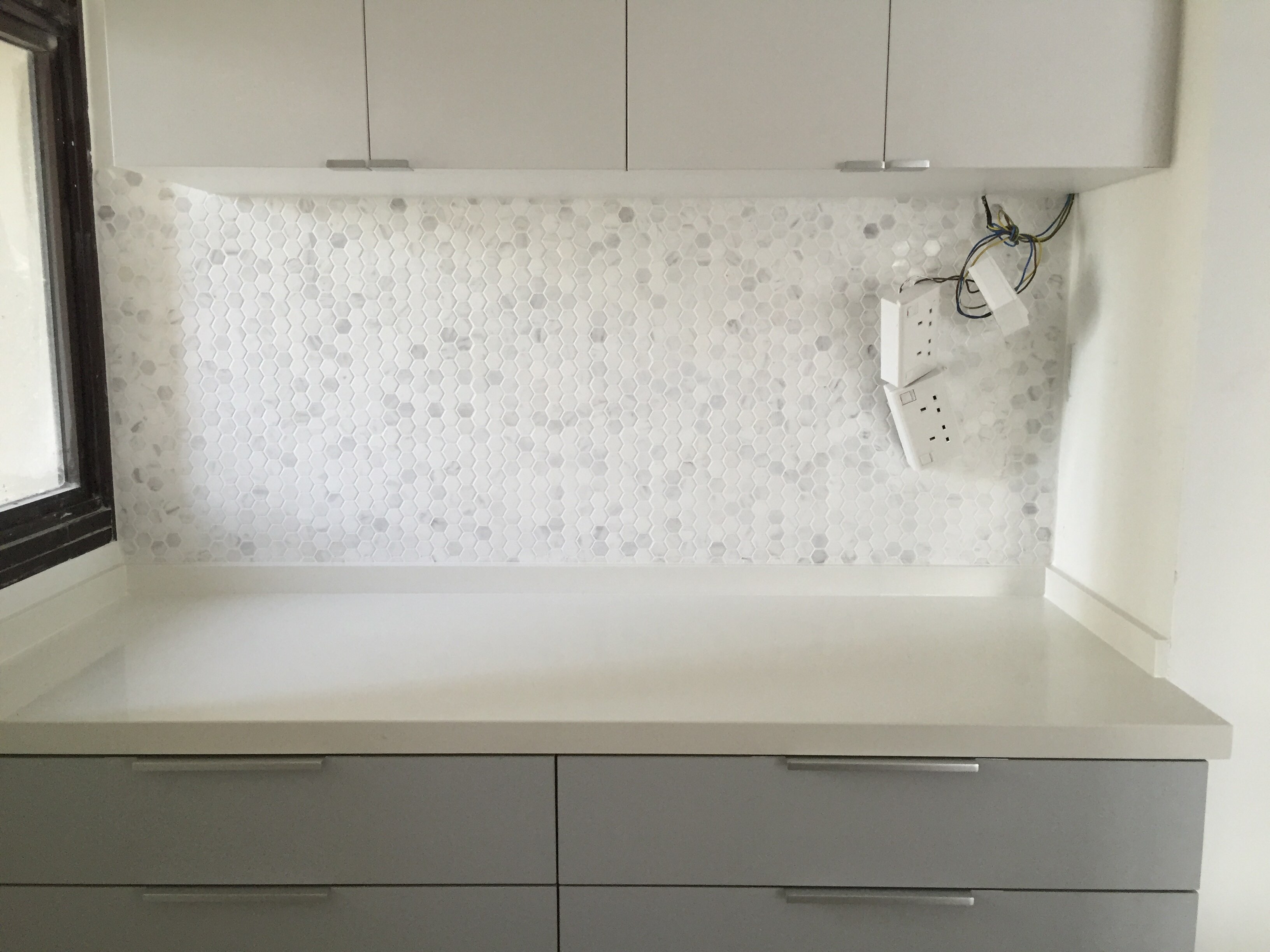 我铺在厨房不炒菜的那一边的backsplash。好像这种砖是比较麻烦,我的contractor先是抱怨了几句后来还是叫工人帮我铺了哈哈,出来效果还可以。下图为还没有擦干净表面的白灰的样子,所以略白...