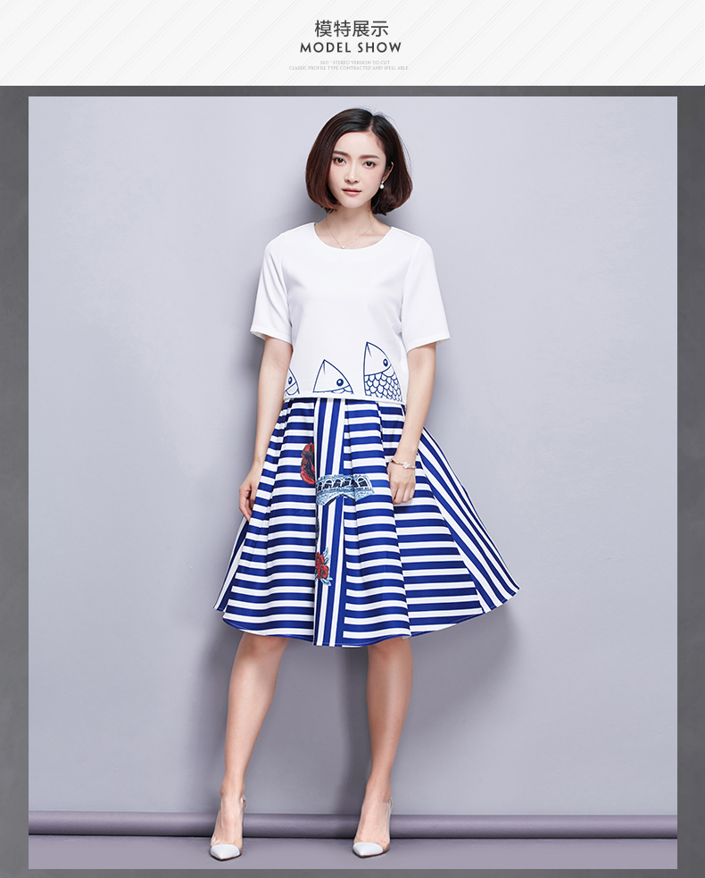 2. 全新宽松短上衣+印花条纹A字裙一套,SGD35