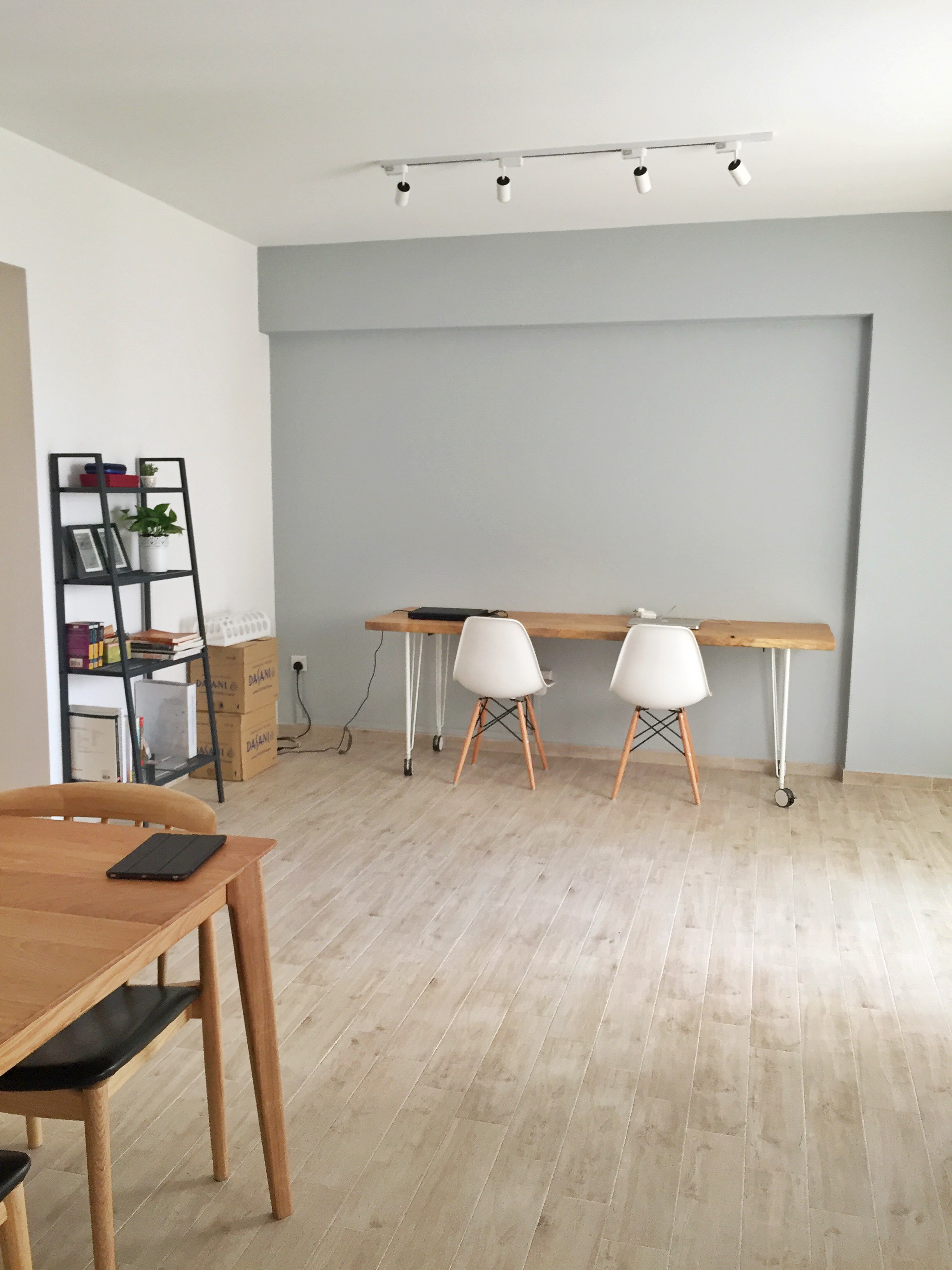 我们敲掉了第一幅图上两把椅子对着的那个墙,这样一进门是一个很开阔的空间,原本的那个卧室变成客厅,然后第二幅图的地方打算做开放的书房。吊顶拆掉了,地板全部敲掉重新铺的瓷砖,然后刷漆,装灯,现在硬装做完是这样的: