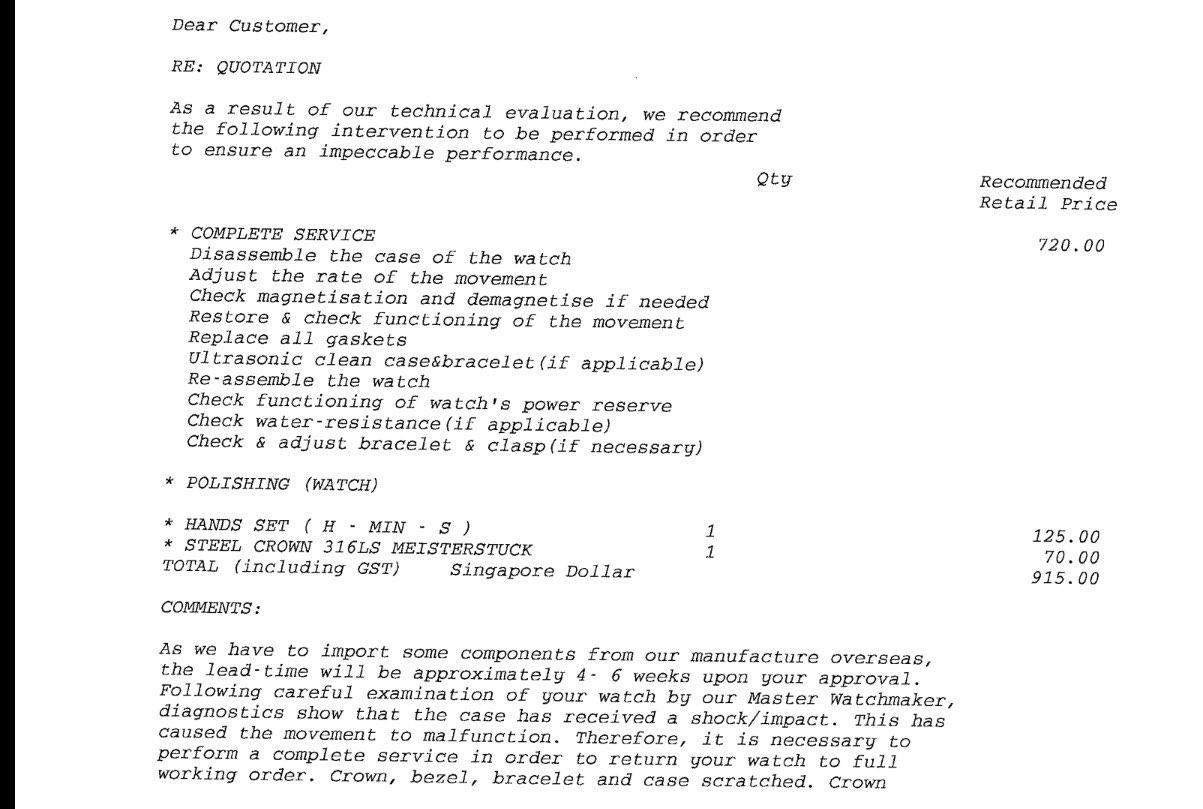 Service centre的回馈是,“your watch case has received a shock/impact and this is due to the knocks which resulted to the case and case-back dented. As such, your case is not cover under warranty and a complete service is recommended to restore your watch to a full working condition.” 和 “Montblanc guarantees the quality of the materials, faultless workmanship and flawless operation as per stated on the Service Guide (Watches). However, this warranty does not apply to damage resulting from accident, improper use (knocks, dents, crushing), dismantling or repair by anyone other than an authorized Montblanc repair specialist, to watches which have had their identification numbers removed or have been otherwise defaced or altered, or to normal wear and tear. ”价格为$915。