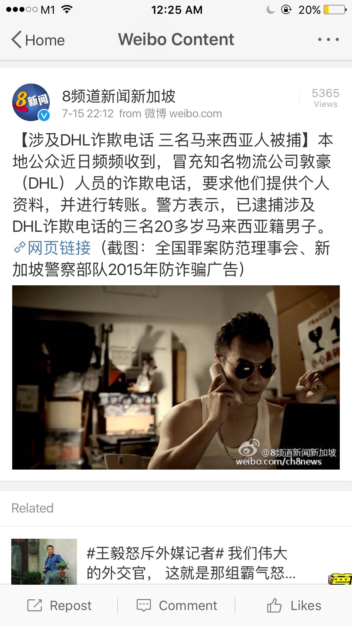 南瓜同学 • • 46623 次浏览本地公众近日频频收到,冒充知名物流公司敦豪(DHL)人员的诈欺电话,要求他们提供个人资料,并进行转账。警方表示,已逮捕涉及DHL诈欺电话的三名20多岁马来西亚籍男子。