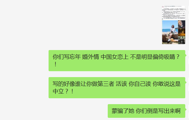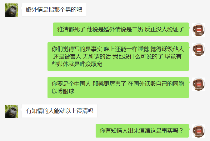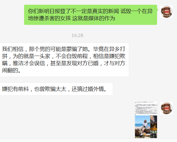 在这里我要曝光新明日报,一个媒体为吸睛而诋毁在异国他乡被害遭弃尸荒野的女孩,也许就是现今很多媒体的日常。今早,一名新明日报工作者冒充雅洁的朋友来向我套取消息,自称是雅洁朋友的朋友,但未表示关心,我觉得有可能有假就没有透露消息。并表示作为朋友只希望罪犯绳之以法,媒体不要大肆报道。下午我看到了有人开始分享新明日报的新闻,放出照片不打马赛克,你以为是报道明星八卦吗?还一口一个小三,中国女恋上48岁男子,婚外恋等等为了吸睛的词语。作为朋友我去质问了新明日报的工作者,无良媒体的嘴脸显露无疑: