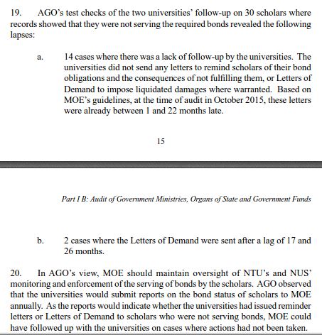 lmj8808 • • 46334 次浏览今天看到政府的审计机构报告里面提到了关于NUS NTU奖学金的事项,测试了30个样本,16个scholars都没有serve bond,超过半数,实在令人寒心。而且MOE, NUS, NTU发的Letter of Demand也大多都是迟了1个月到22个月,有2个样本迟了17个月到26个月。只能说政府部门办事效率还是不够有效,才导致了有机可乘。