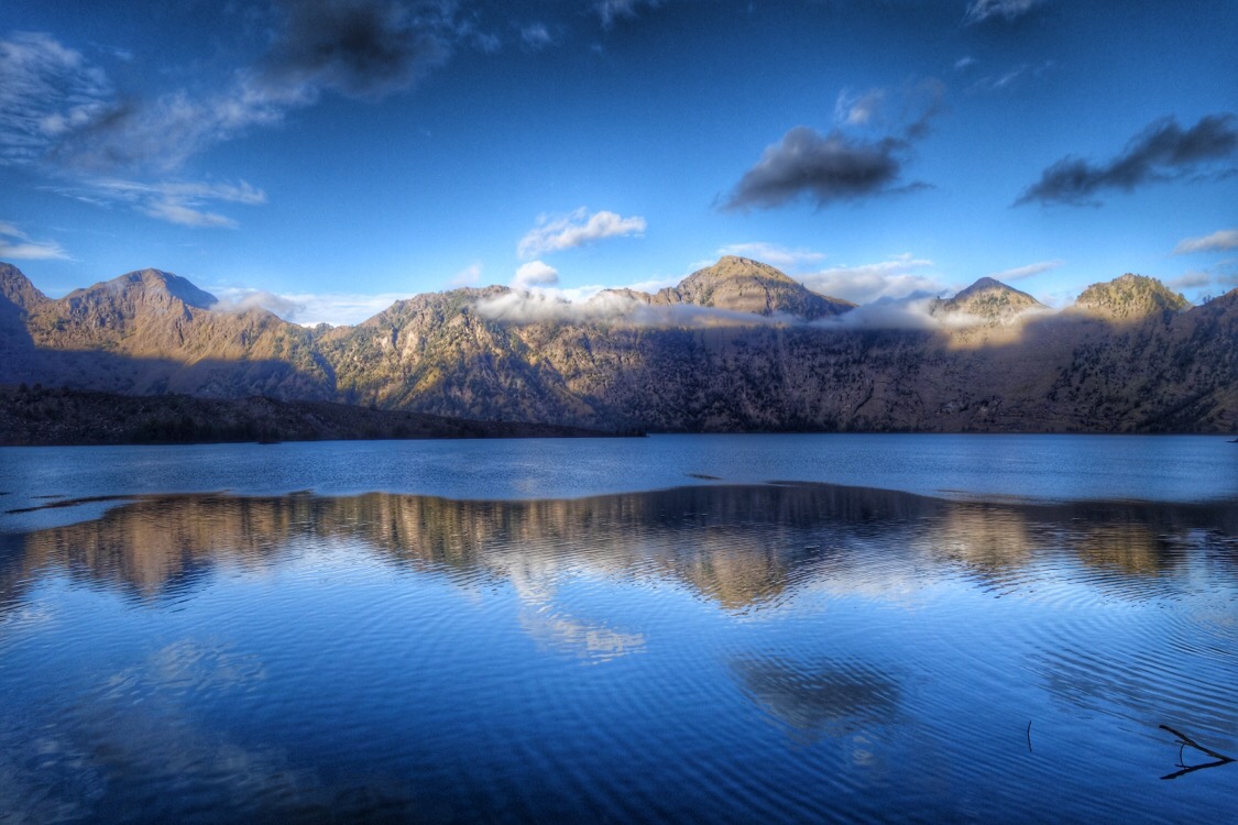 下山的时候一路云雾茫茫,但在从露营地到湖边路上有一段云雾散去,露出湖的一角~
